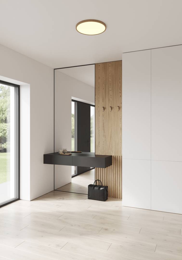 Erittäin ohut plafondi integroidulla LED-valolla ja Moodmaker-toiminnolla, jonka avulla voit himmentää valoa kolmessa vaiheessa tavallista seinäkytkintä käyttäen. Taustavalo-effekti.