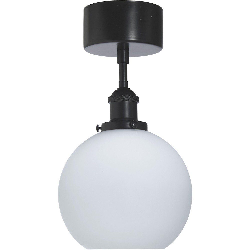Kattovalaisin mattamustaa metallia opaalivalkoisella lasikuvulla. Lasikupu on käsintehty, joten yksittäisiä ilmakuplia ja pientä vaihtelua lasin paksuudessa voi esiintyä kuvussa.