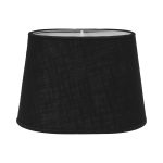 Ovaalin muotoinen lampunvarjostin puuvillakangasta. Kankaassa on elävä, pellavakankaan rakennetta muistuttava pinta. Valkoinen sisäpinta ja reunusnauha.