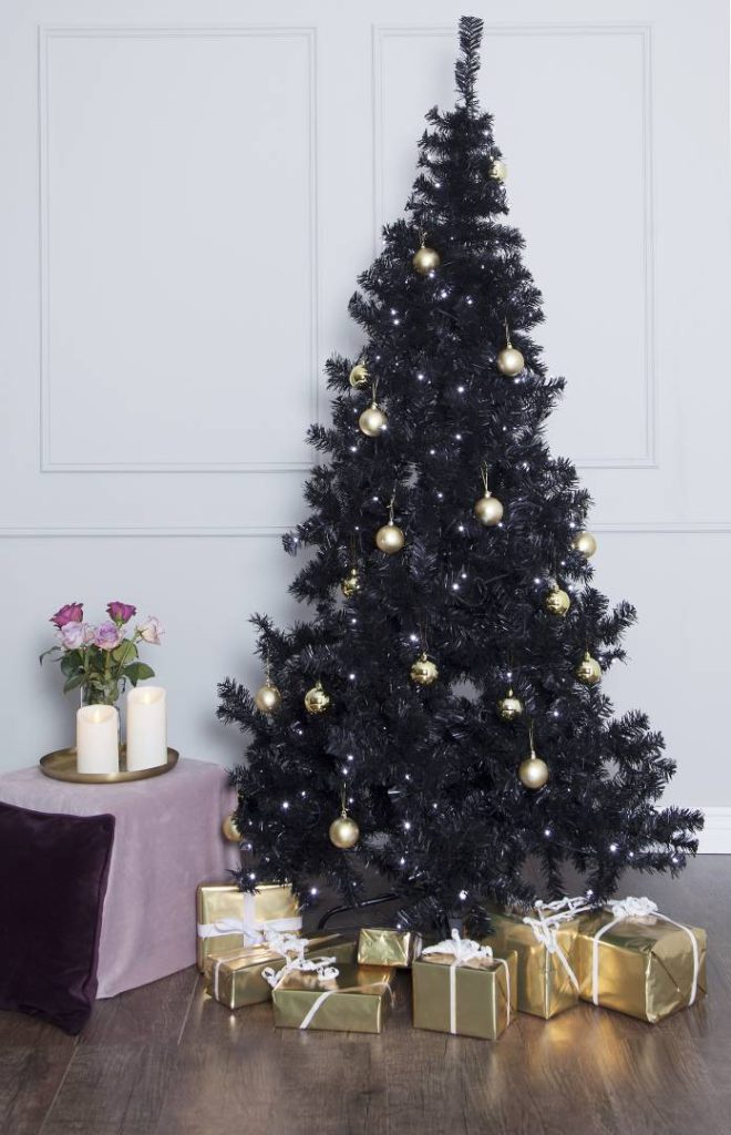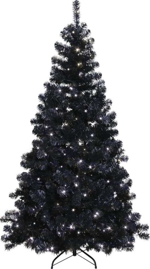 Musta joulukuusi, joka sopii sekä ulko- että sisäkäyttöön. Mukana 260-osainen