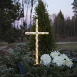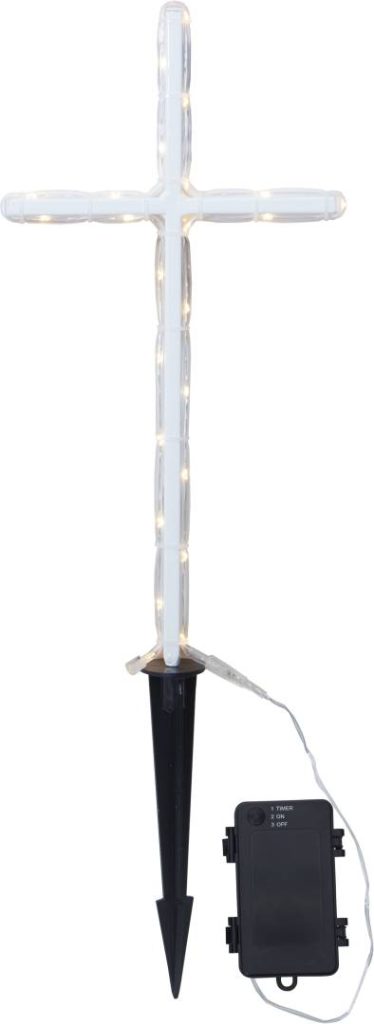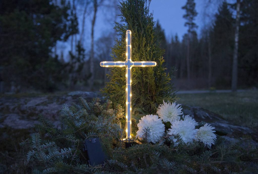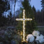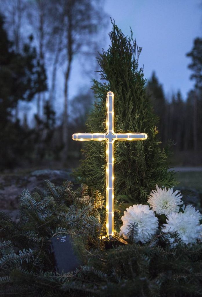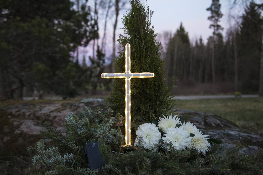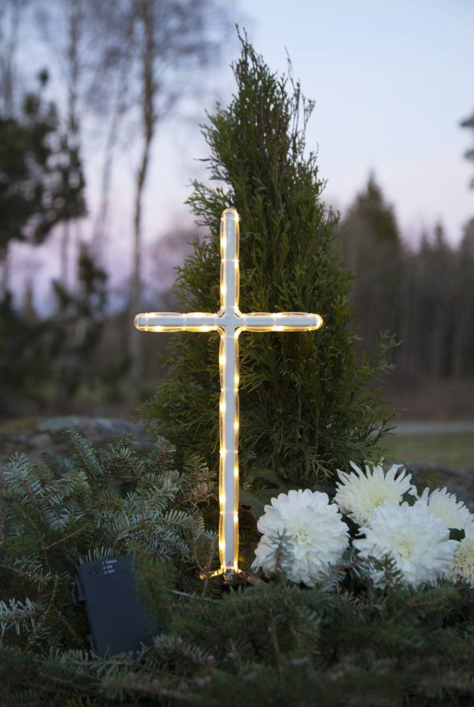 Kaunis risti lämpimän valkoisilla LED-valoilla. Sopii esimerkiksi haudalle koristeeksi.