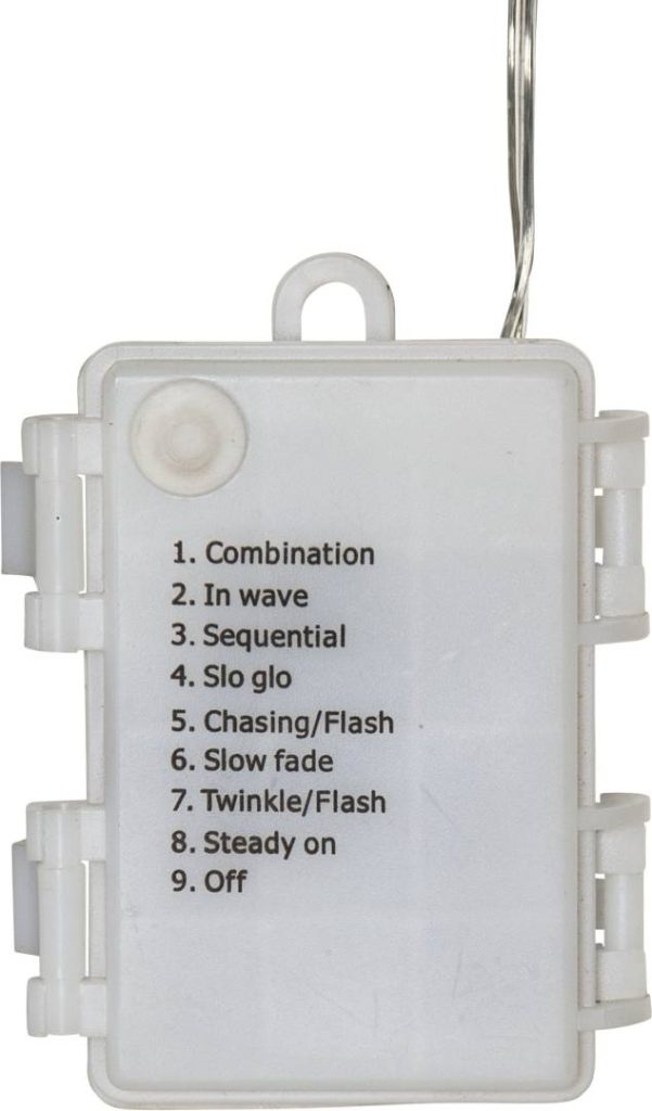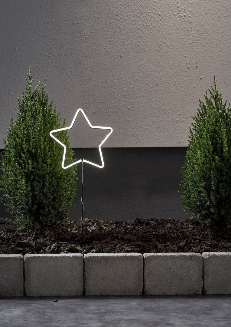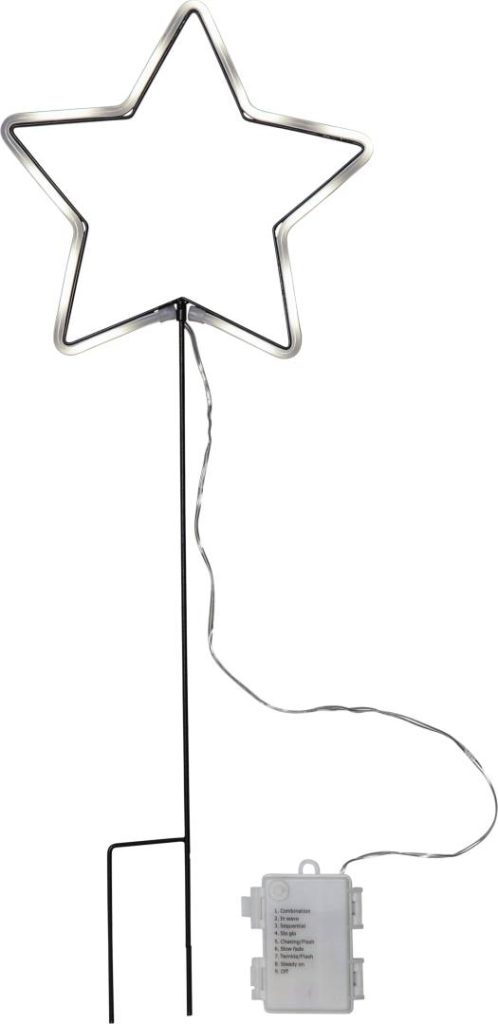 Paristoilla toimiva ulkokäyttöön sopiva tähtikoriste, jossa 72 valkoista LED-valoa. Paristokotelosta voi säätää valoja vilkkumaan eri tavoin tai palamaan tasaisesti.