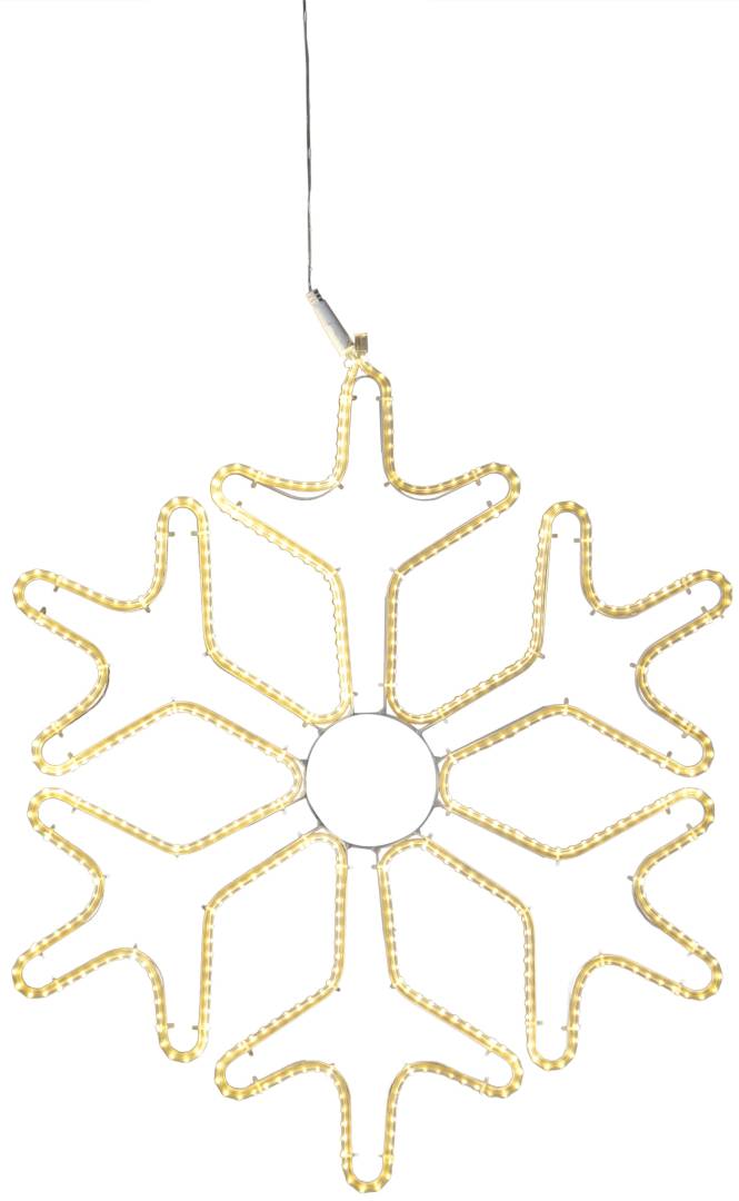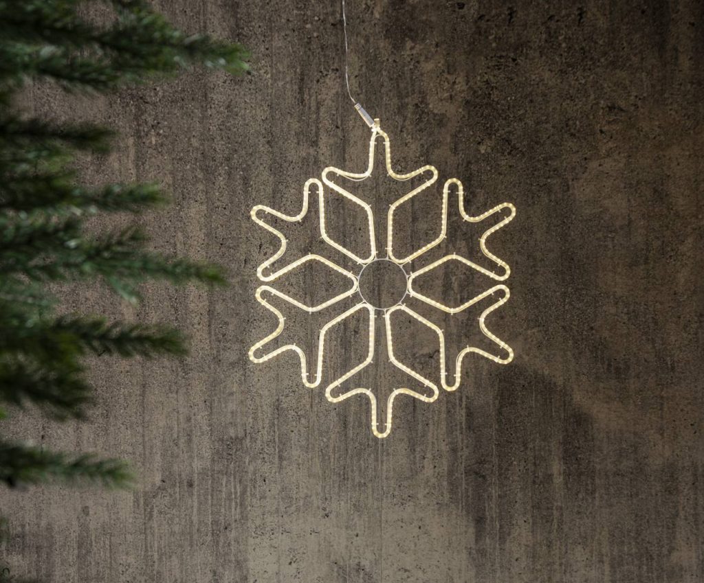 Ulkokäyttöön tarkoitettu lumihiutaleen muotoinen siluetti-koriste, joka sopii esimerkiksi puutarhaan tai julkisivua koristamaan. Koristeessa on 480 lämpimän valkoista LED-valoa.