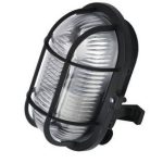Plafondi / kellarivalo suojaverkolla. Runko on mustaa muovia ja kupu kirkasta lasia.