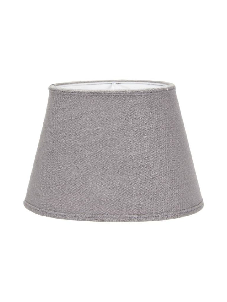 Ovaalin muotoinen lampunvarjostin pellavakangasta. Valkoinen sisäpinta, rullatut reunat.