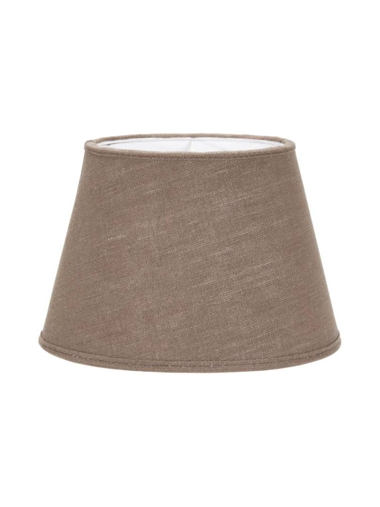 Ovaalin muotoinen lampunvarjostin pellavakangasta. Valkoinen sisäpinta, rullatut reunat.