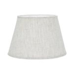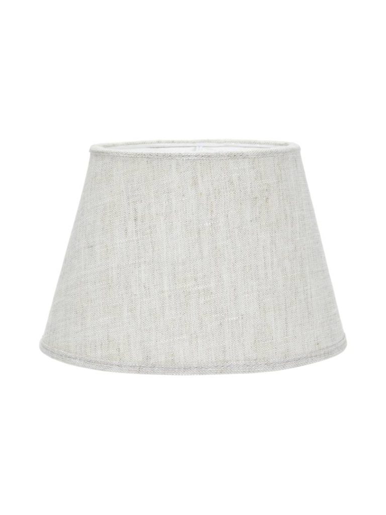Ovaalin muotoinen lampunvarjostin pellavakangasta. Valkoinen sisäpinta, rullatut reunat.