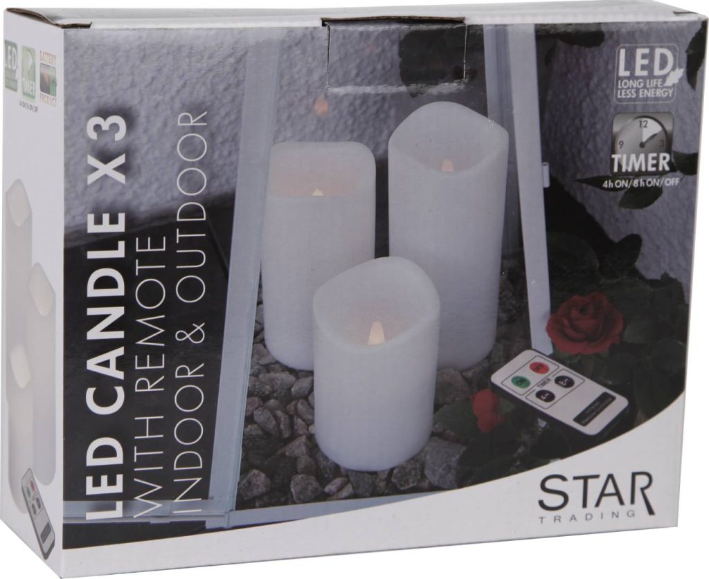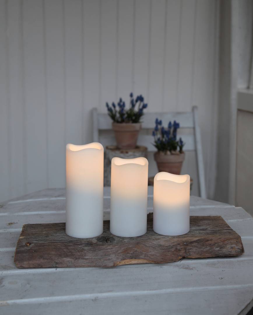 Sisä- ja ulkokäyttöön sopivat valkoiset muovikynttilät 3 kappaleen pakkauksessa. Valon sävy: lämmin valkoinen. Mukana kaukosäädin.