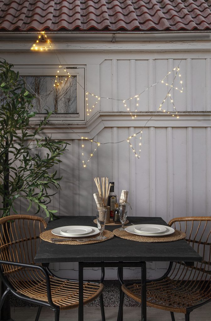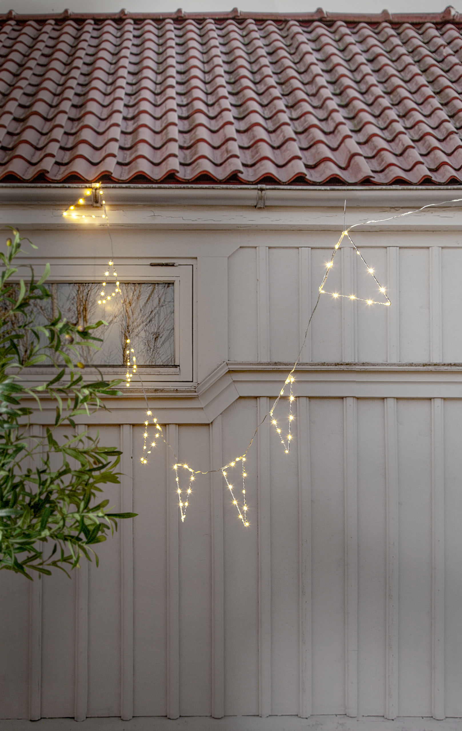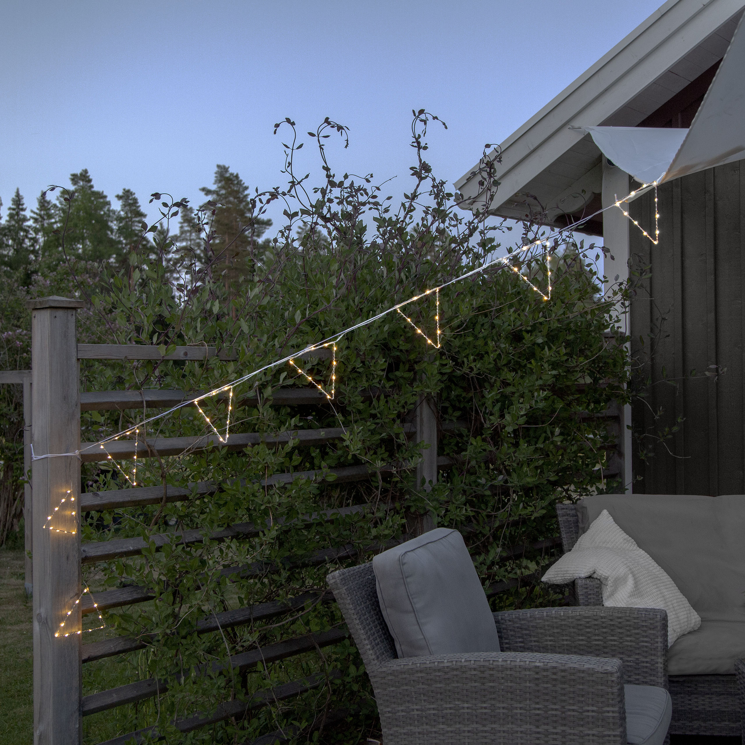 Ulkokäyttöön sopiva koristevalosarja, jossa 8 hopeanväristä metalliviiriä. Jokaisessa viirissä on 11 pientä lämpimän valkoista LED-valopistettä. Sopii valaisemaan ulkotiloja sekä arkena että juhlissa.