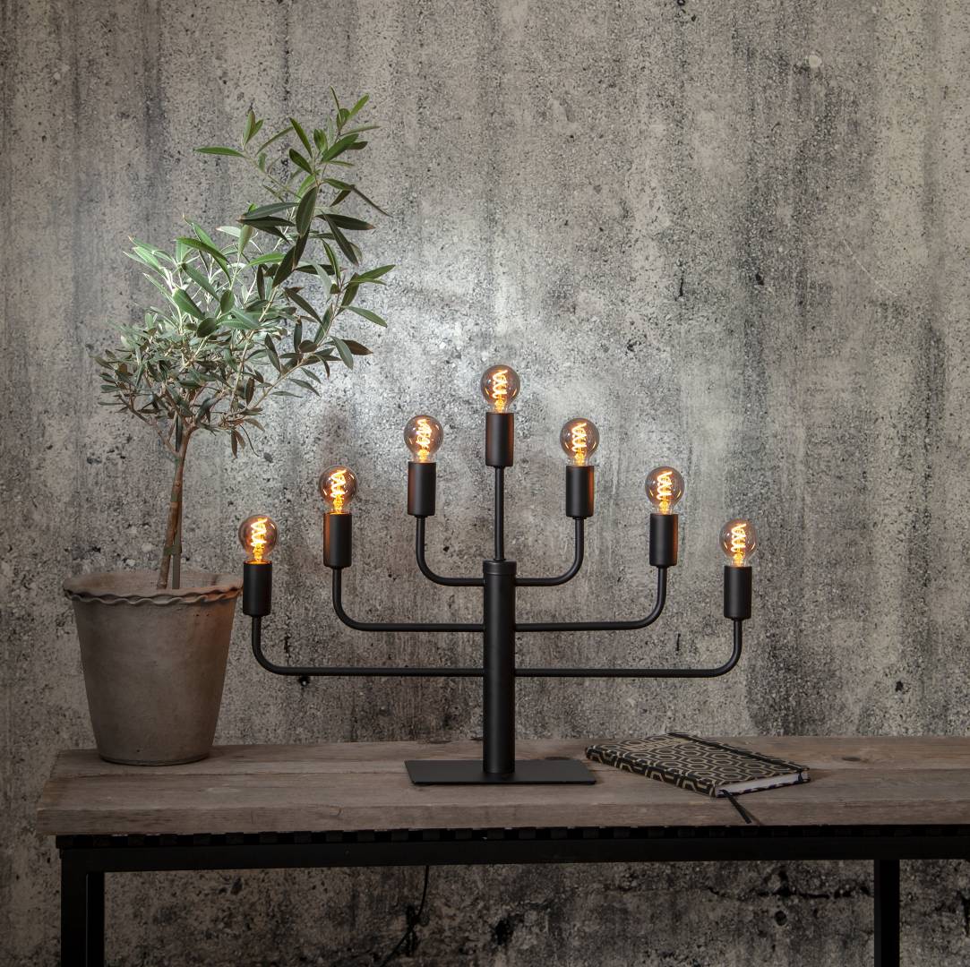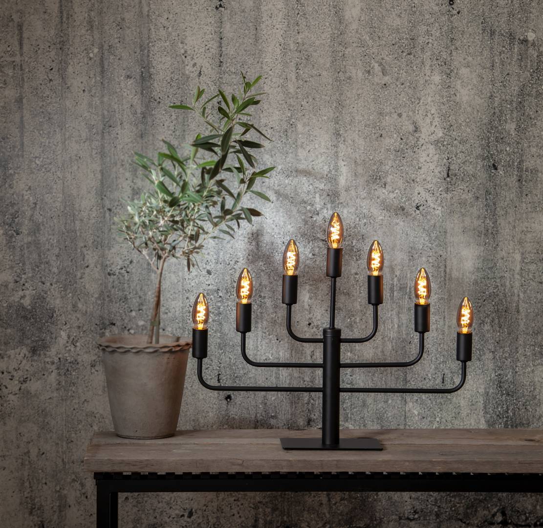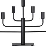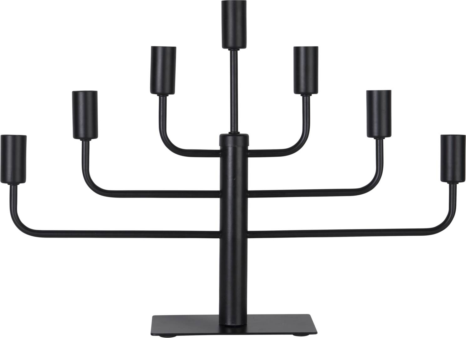 Tyylikäs musta 7-haarainen metallikynttelikkö sisäkäyttöön.