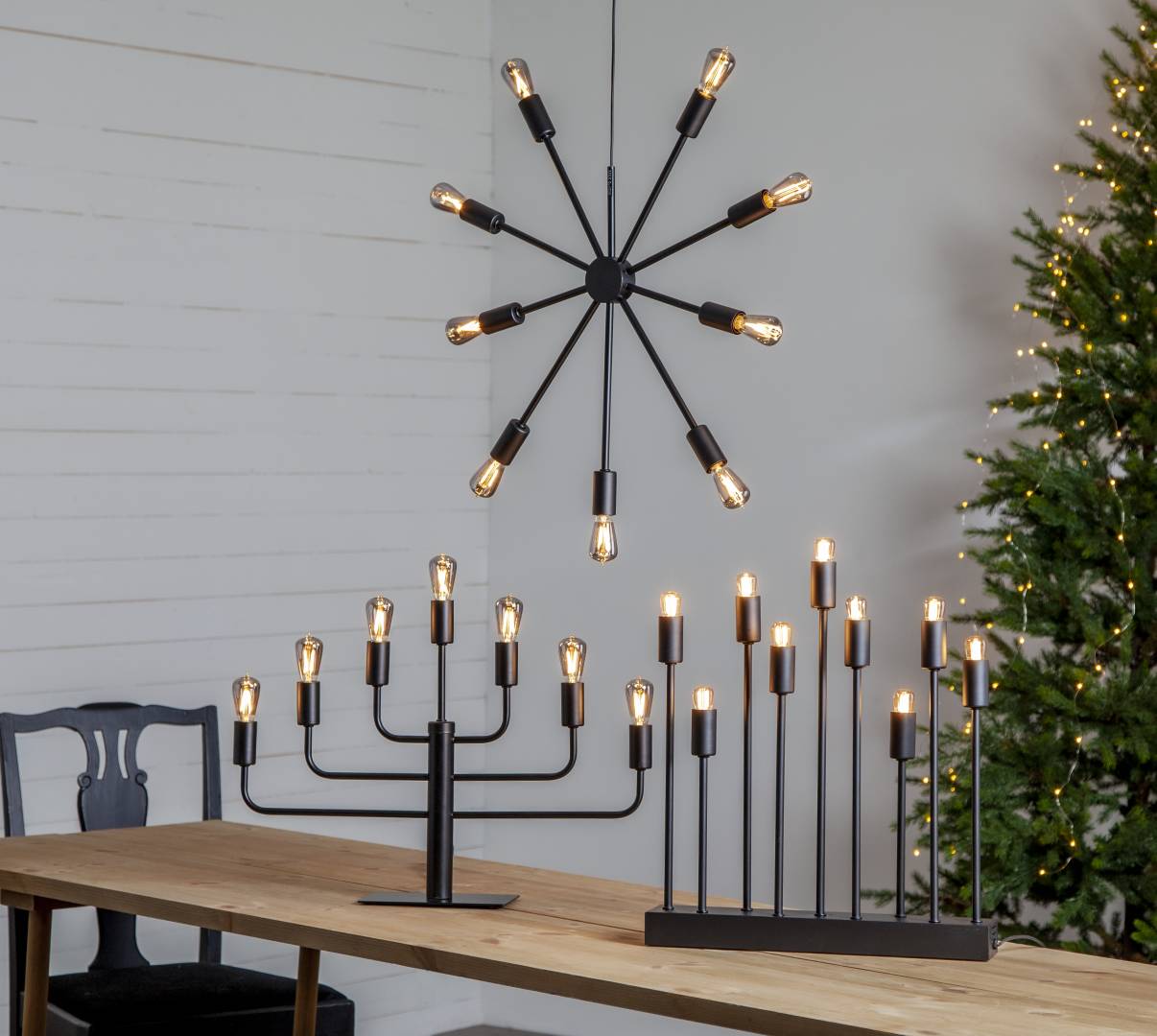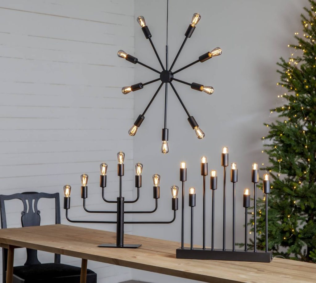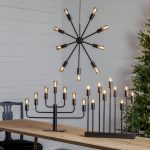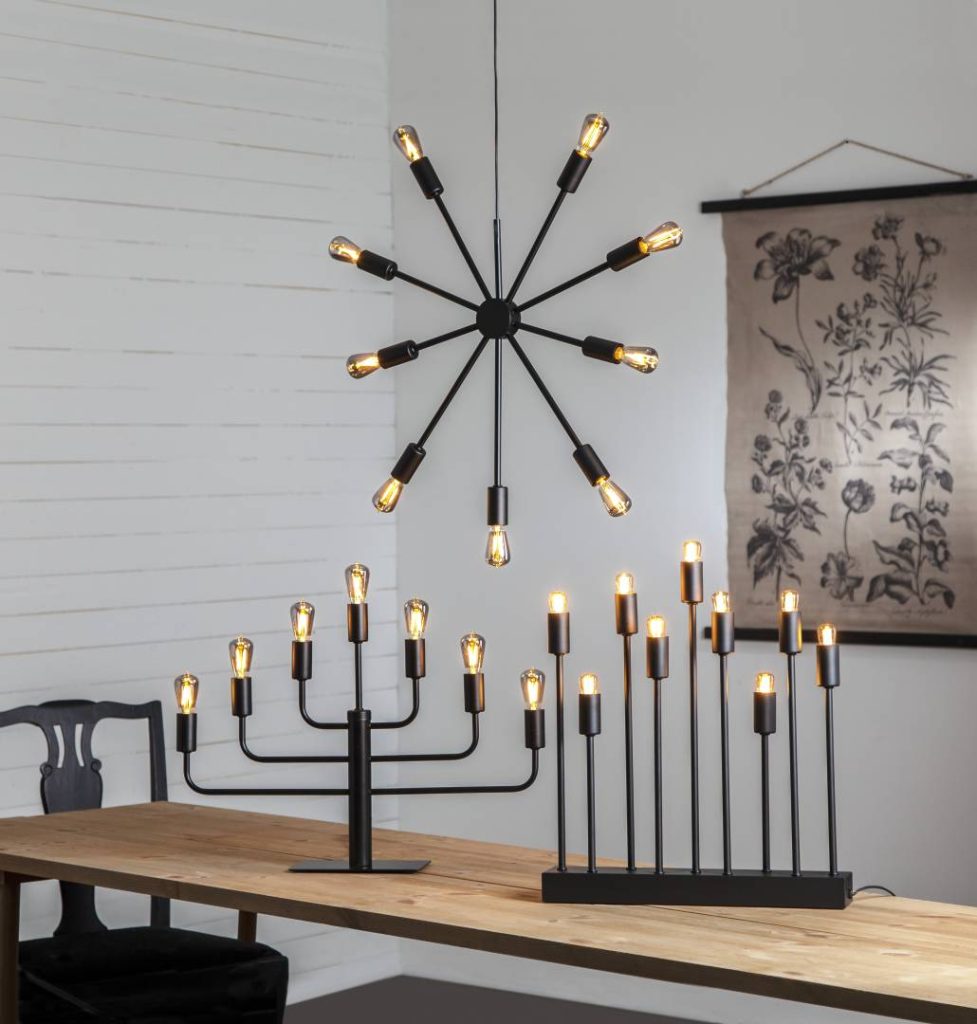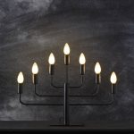 Tyylikäs musta 7-haarainen metallikynttelikkö sisäkäyttöön.