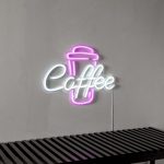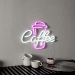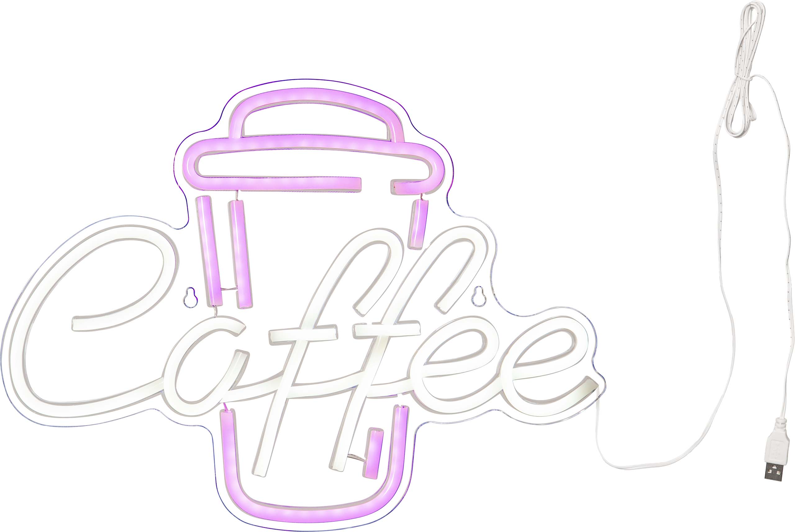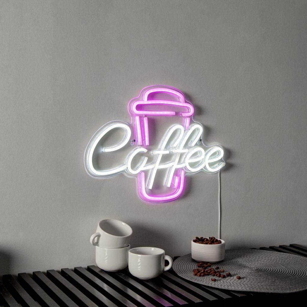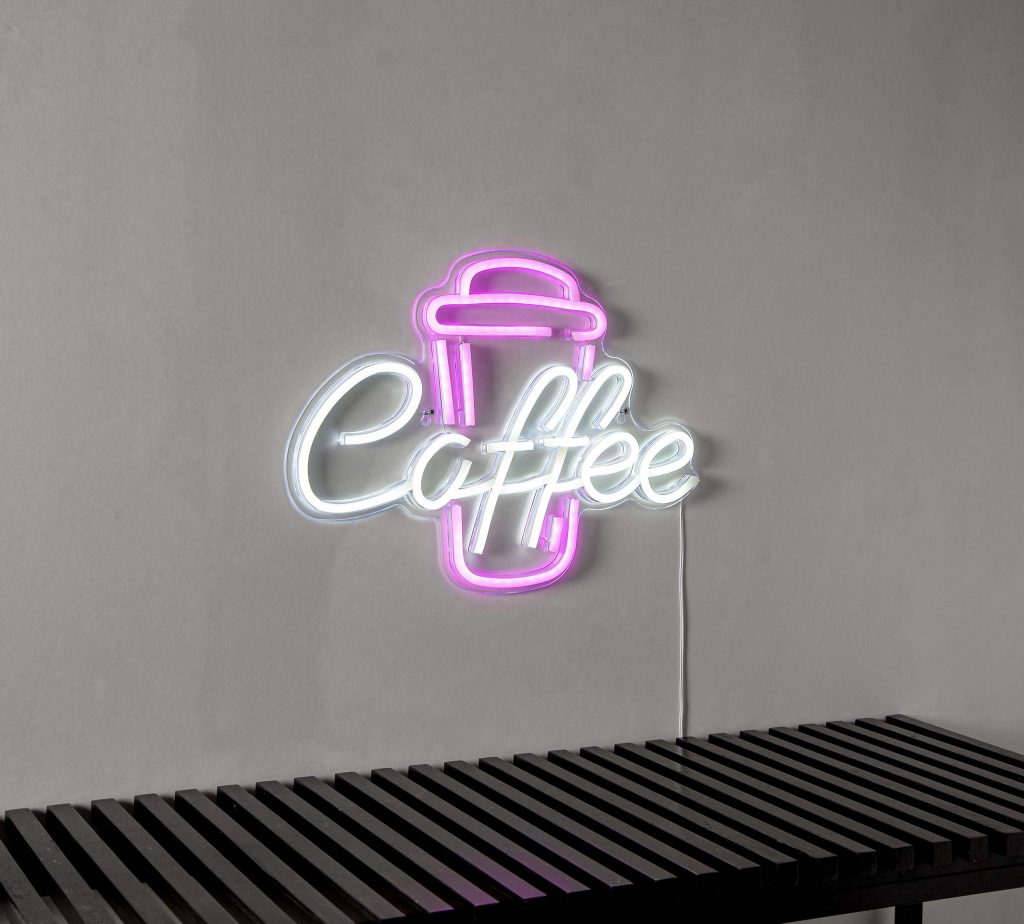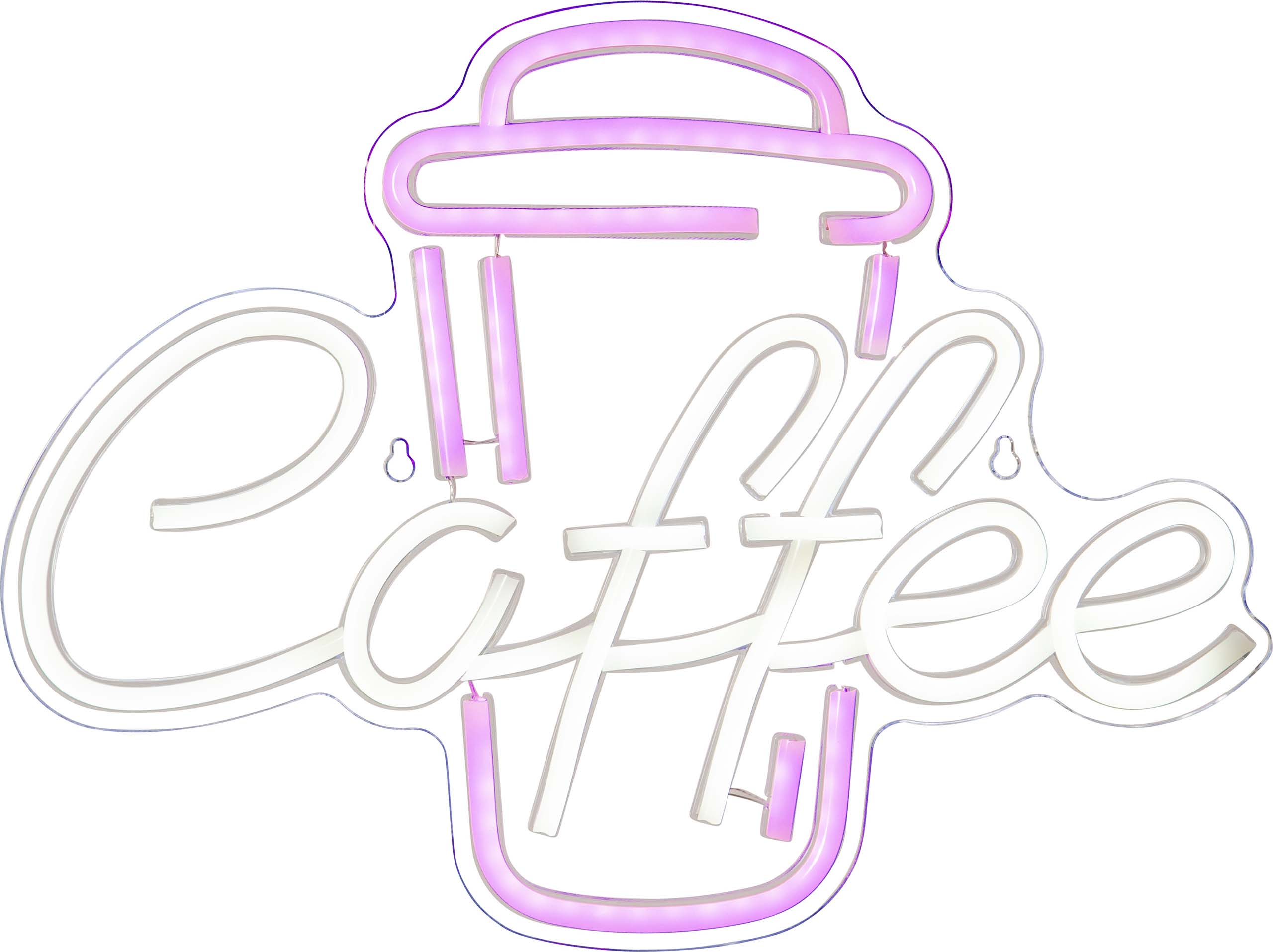 Sisäkäyttöön sopiva seinäkoriste tekstillä ’Coffee’. Läpinäkyvä pleksilevy, jossa valkoisen ja roosan väriset LED-valot. USB-kaapeli. Vaatii 5V virtalähteen, joka ei sisälly pakkaukseen.
