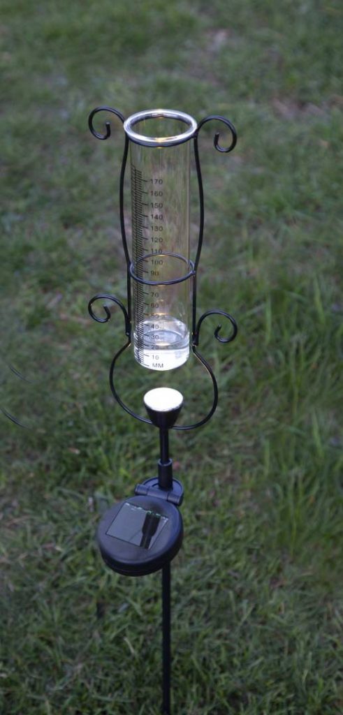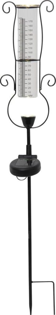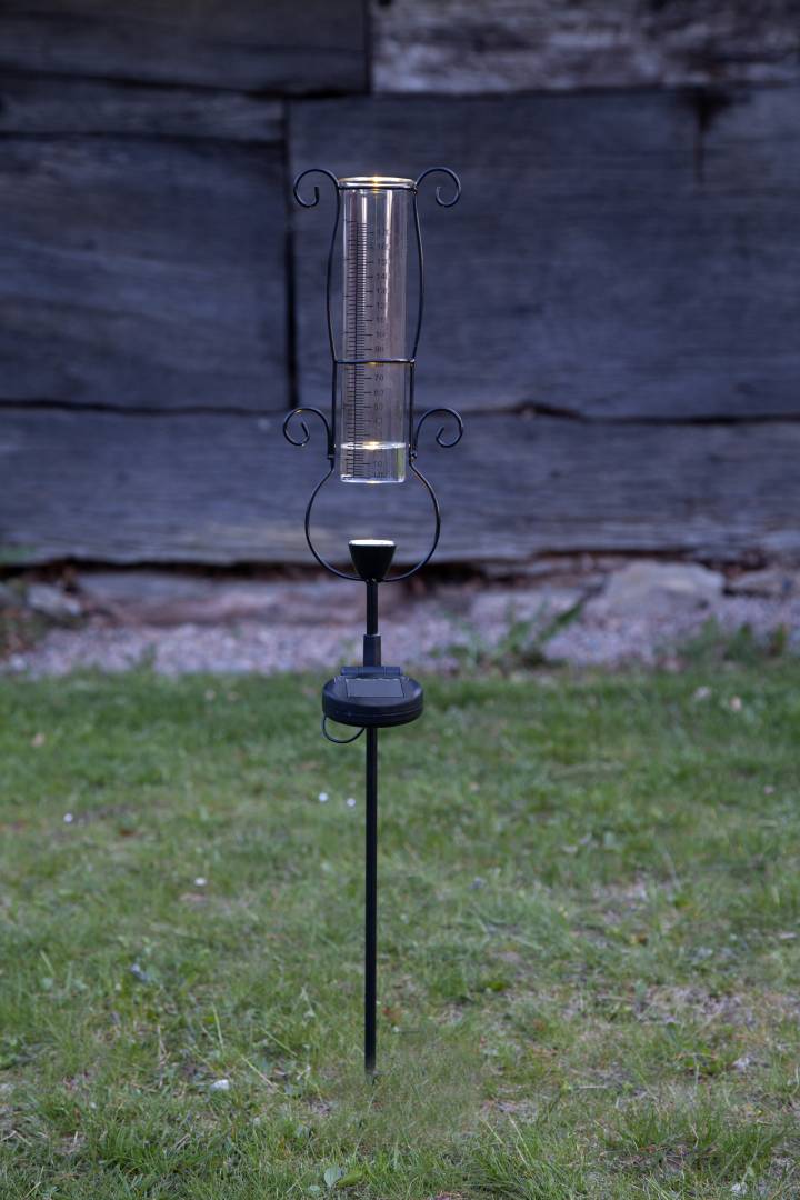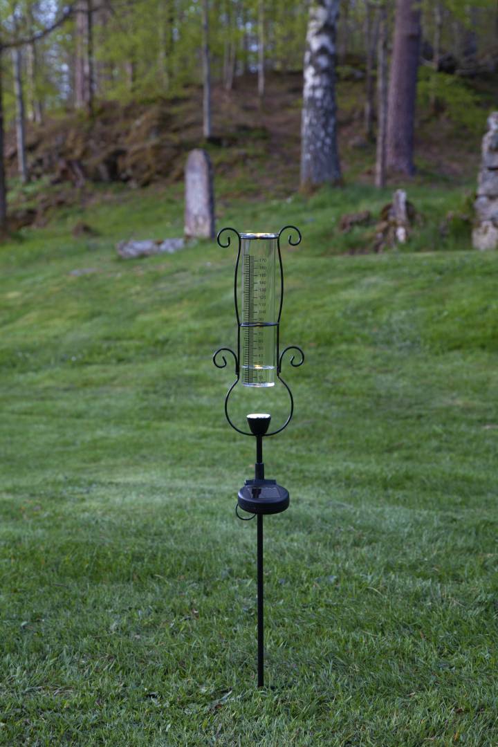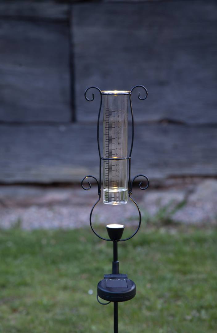 Sademittari, jossa on aurinkokennolla toimiva valaisin sekä millimetri- ja tuuma-asteikot. Valo loistaa hämärään aikaan lämpimän valkoisena.
