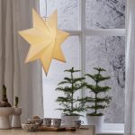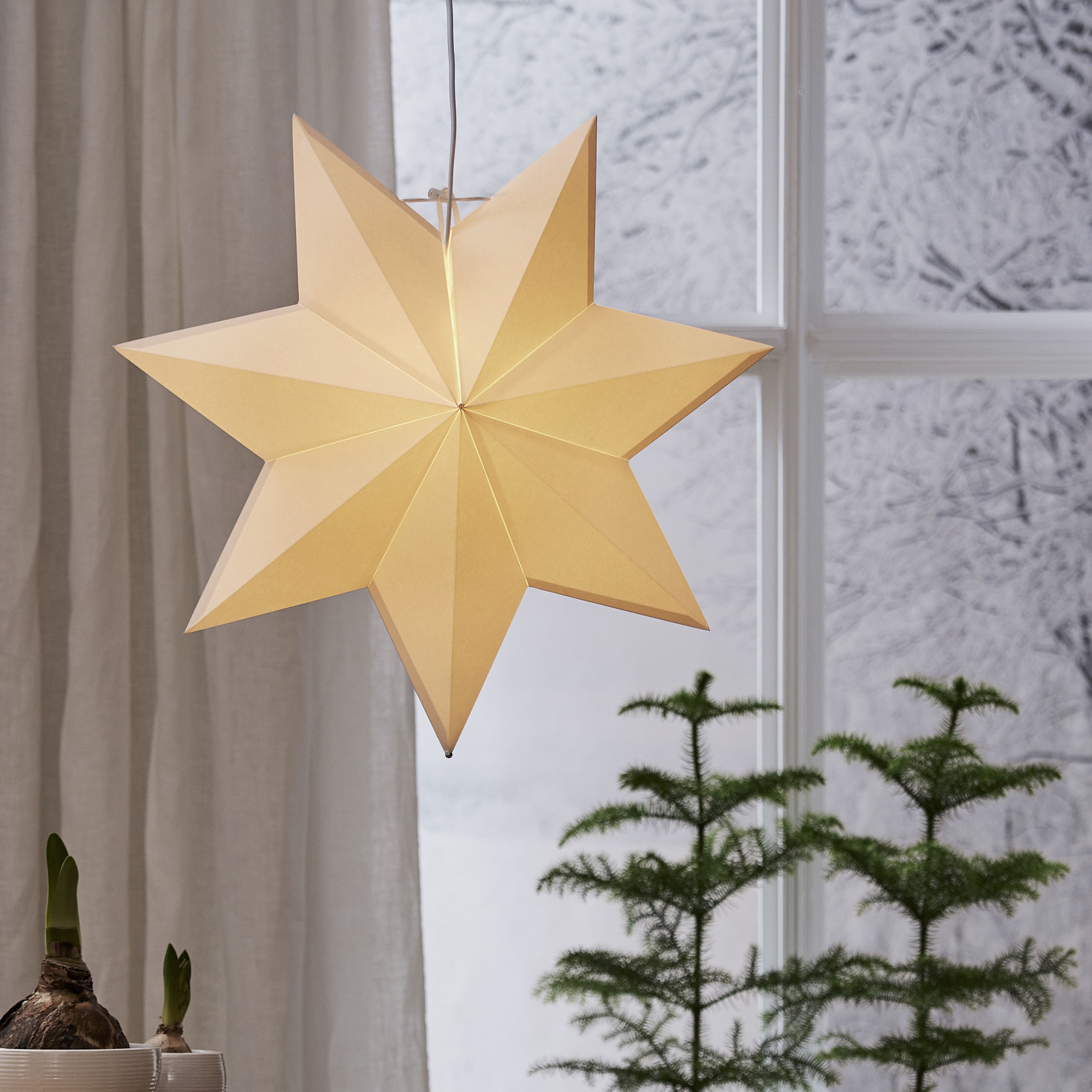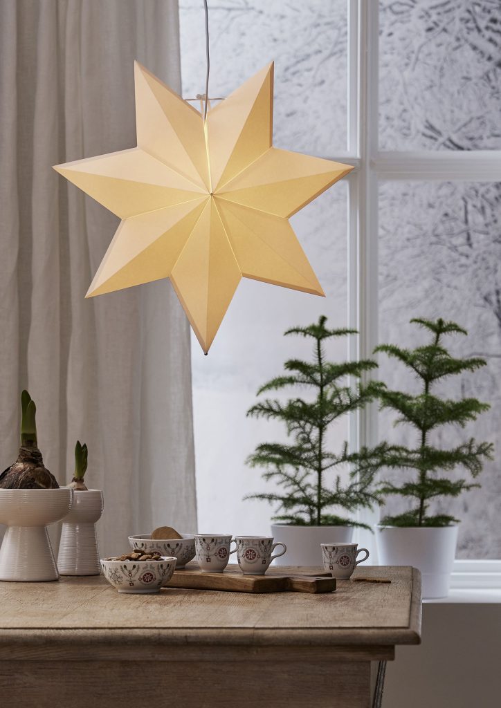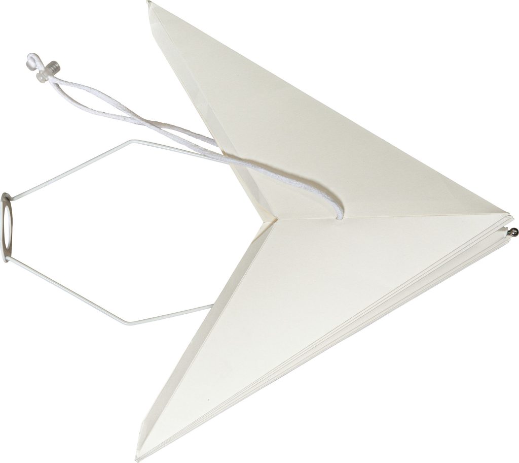 Klassisen mallinen valkoinen paperitähti, jonka voi joko ripustaa ikkunaan tai asettaa lampunjalkaan. Tähden halkaisija on 55 cm.