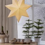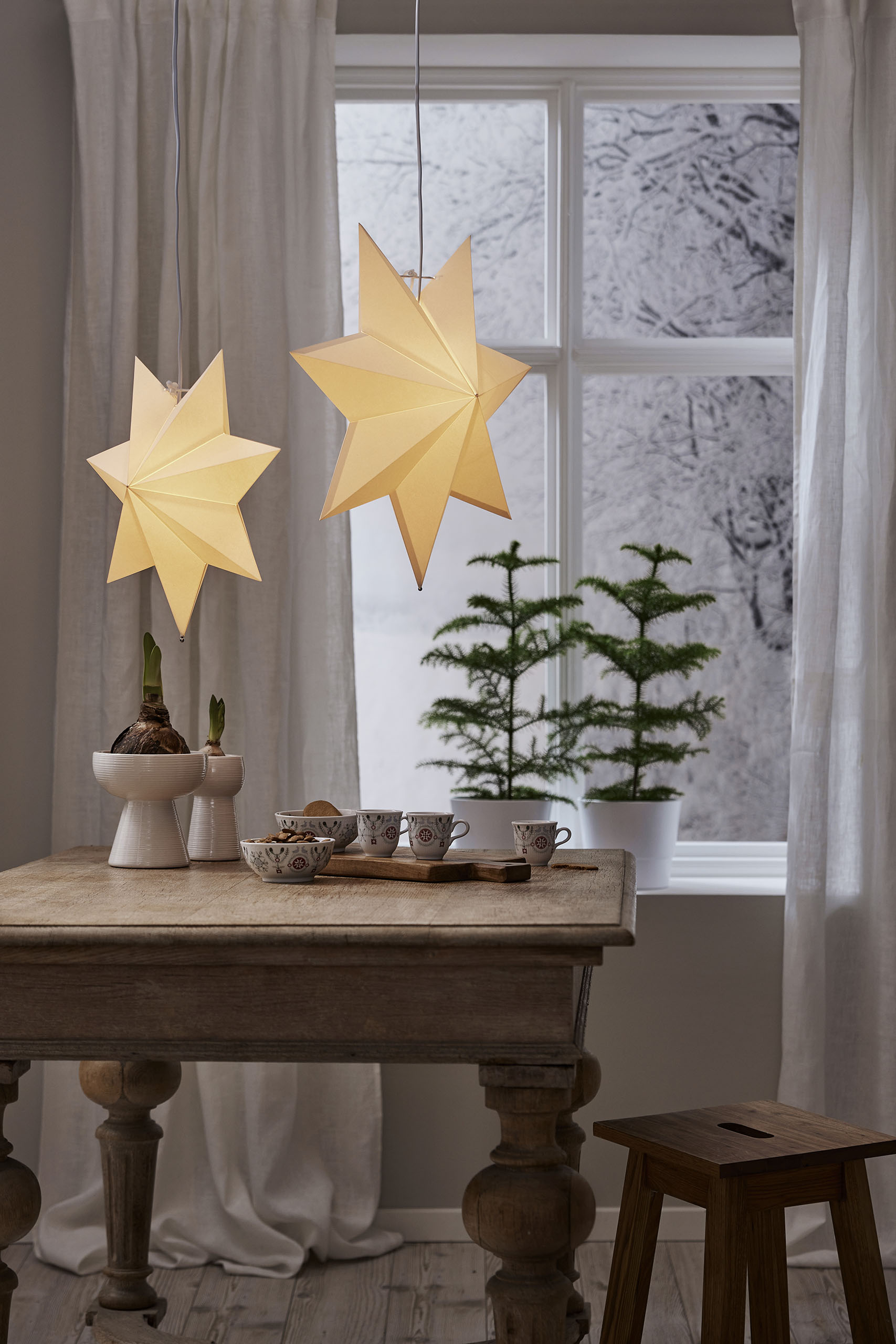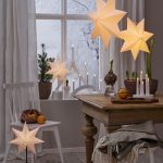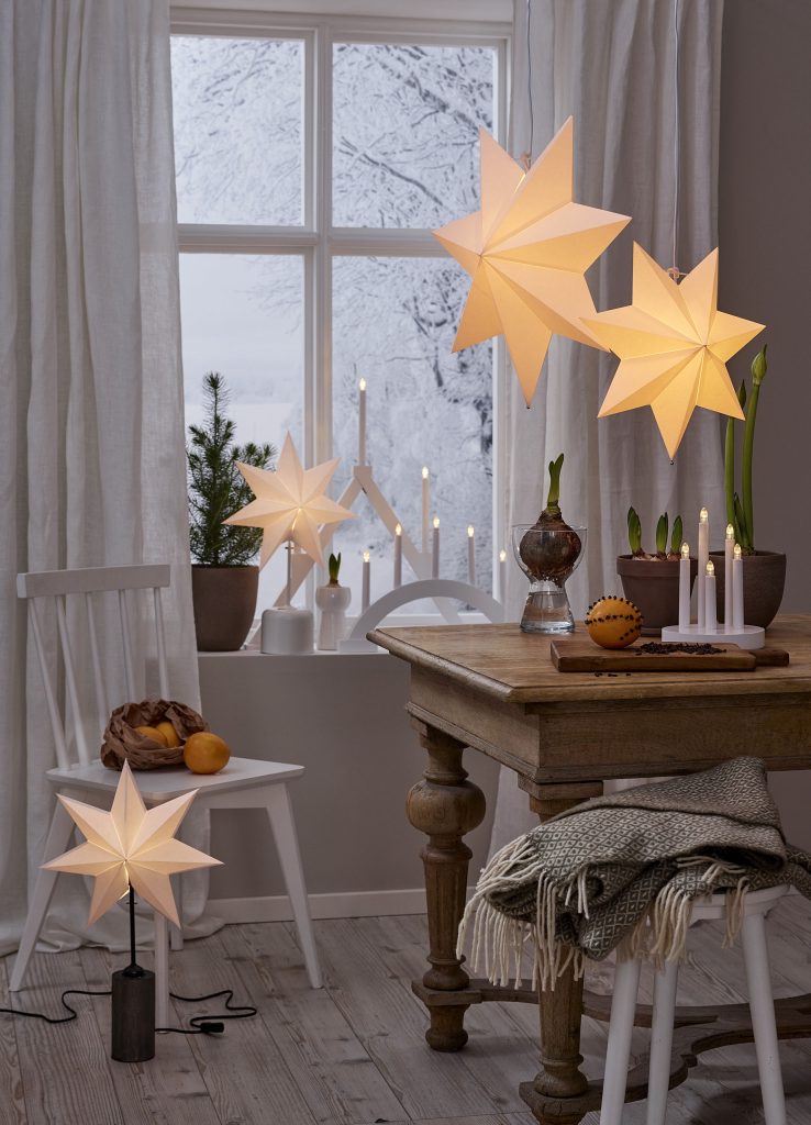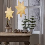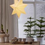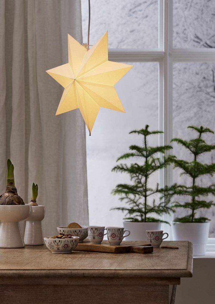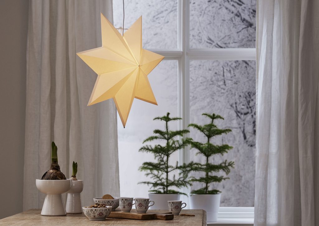 Klassisen mallinen valkoinen paperitähti, jonka voi joko ripustaa ikkunaan tai asettaa lampunjalkaan. Tähden halkaisija on 55 cm.
