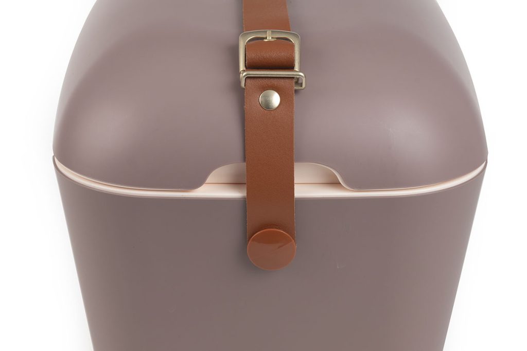 Kannen voi irrottaa ja sitä voi käyttää tarjottimena. Laukussa on tyylikäs nahkainen kantohihna ja kullanvärinen Polarbox-logo.