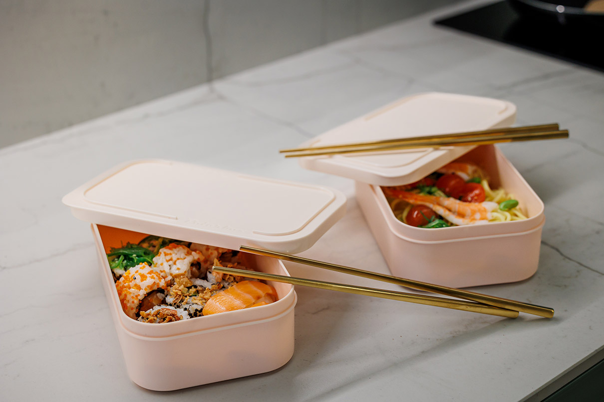 Laukku sisältää kaksi pinottavaa eväsrasiaa, joiden tilavuus on 1 litra. Rasioiden väri on nude, materiaalina on polypropyleeni.