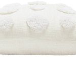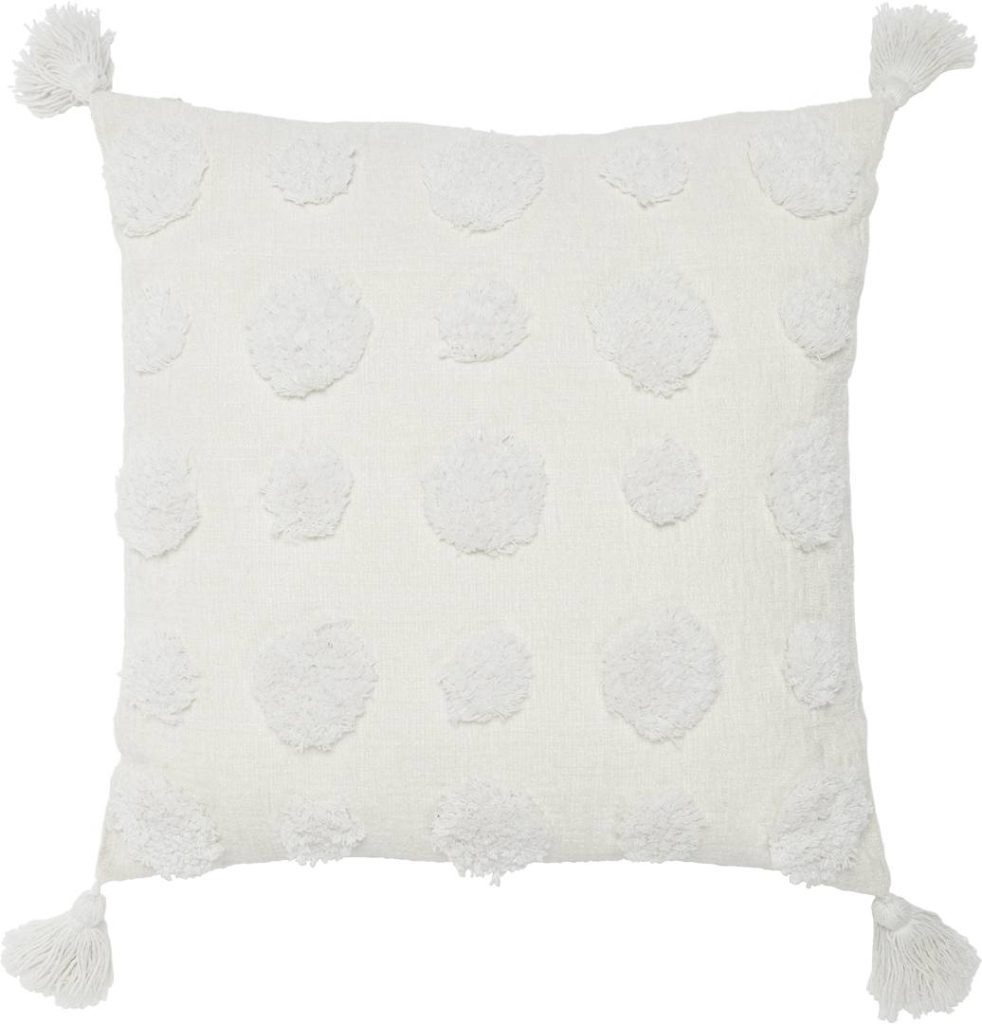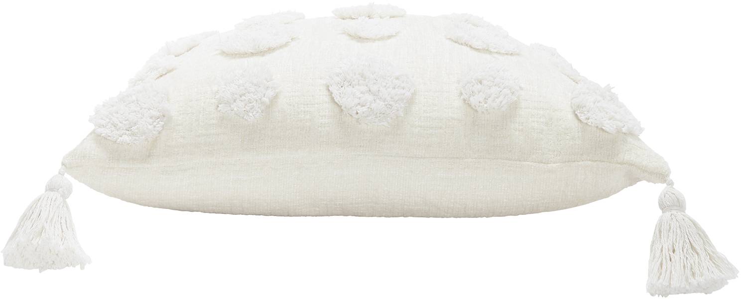 Tyynynpäällinen pehmeää kangasta tuftatuilla kuvioilla ja tupsuilla. Vetoketju alareunassa.