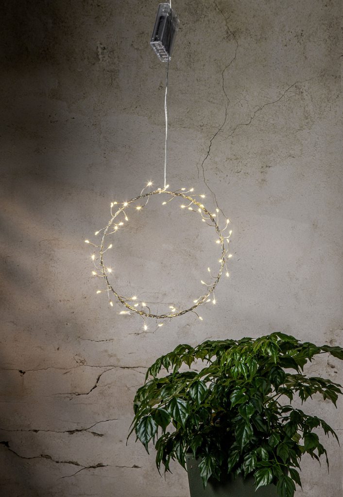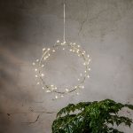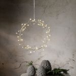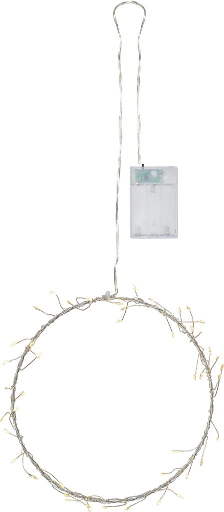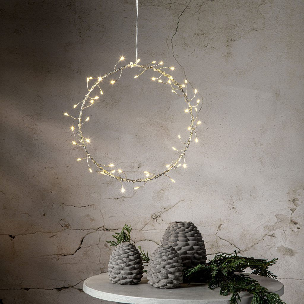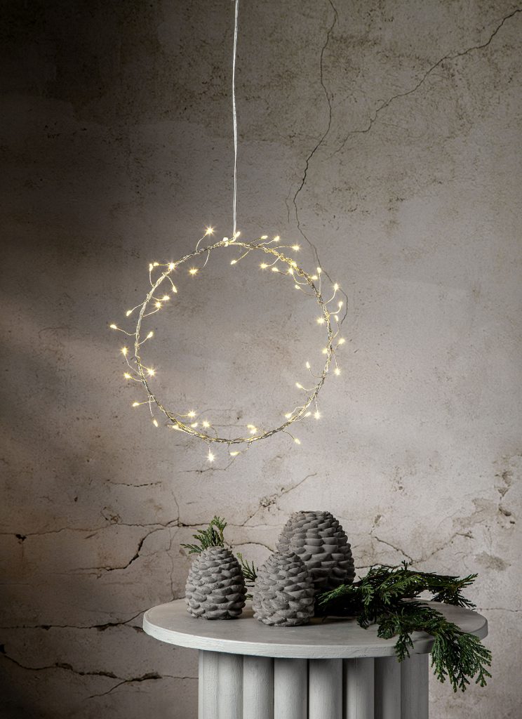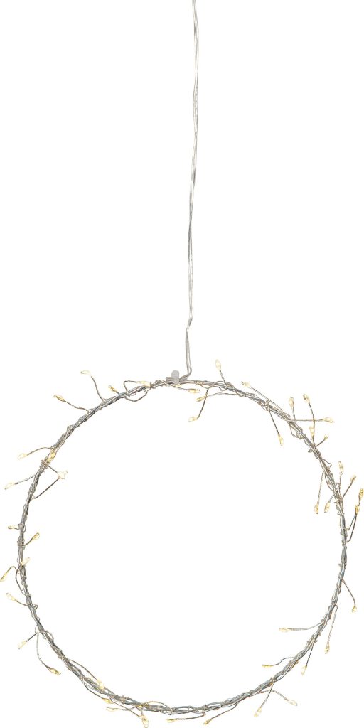 Hopeanvärinen sievä metallikranssi, jota valaisee 50 pientä lämpimän valkoista LED-valopistettä. Sopii sekä jouluun että koko pimeän ajan valokoristeeksi.