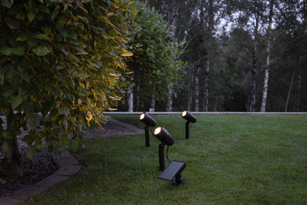 Kolmeosainen aurinkokennolla toimiva spottivalaisinsarja lämpimän valkoisella LED-valolla. Sopii esimerkiksi puiden ja istutusten valaisemiseen. Johto valaisinten välillä on 1 m pitkä, ja johto erilliseen aurinkopaneeliin on pituudeltaan 2 metriä. Spottien valovirta on 75 lumenta.