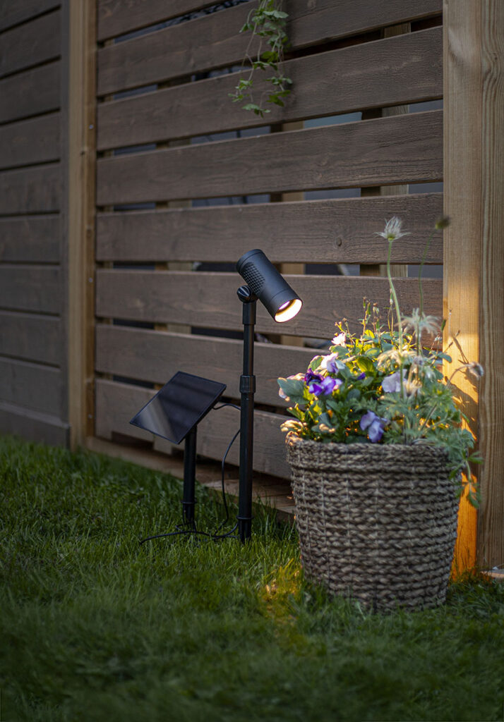 Aurinkokennolla toimiva spottivalaisin, joka hämärällä valaisee lämpimän valkoisella LED-valolla 250 lumenin valoteholla 4 tunnin ajan tai 125 lumenin valoteholla jopa 8 tuntia (täydellä akulla, vaatii 6 tunnin latauksen auringonpaisteessa). Sopiva valoteho valitaan katkaisijasta.