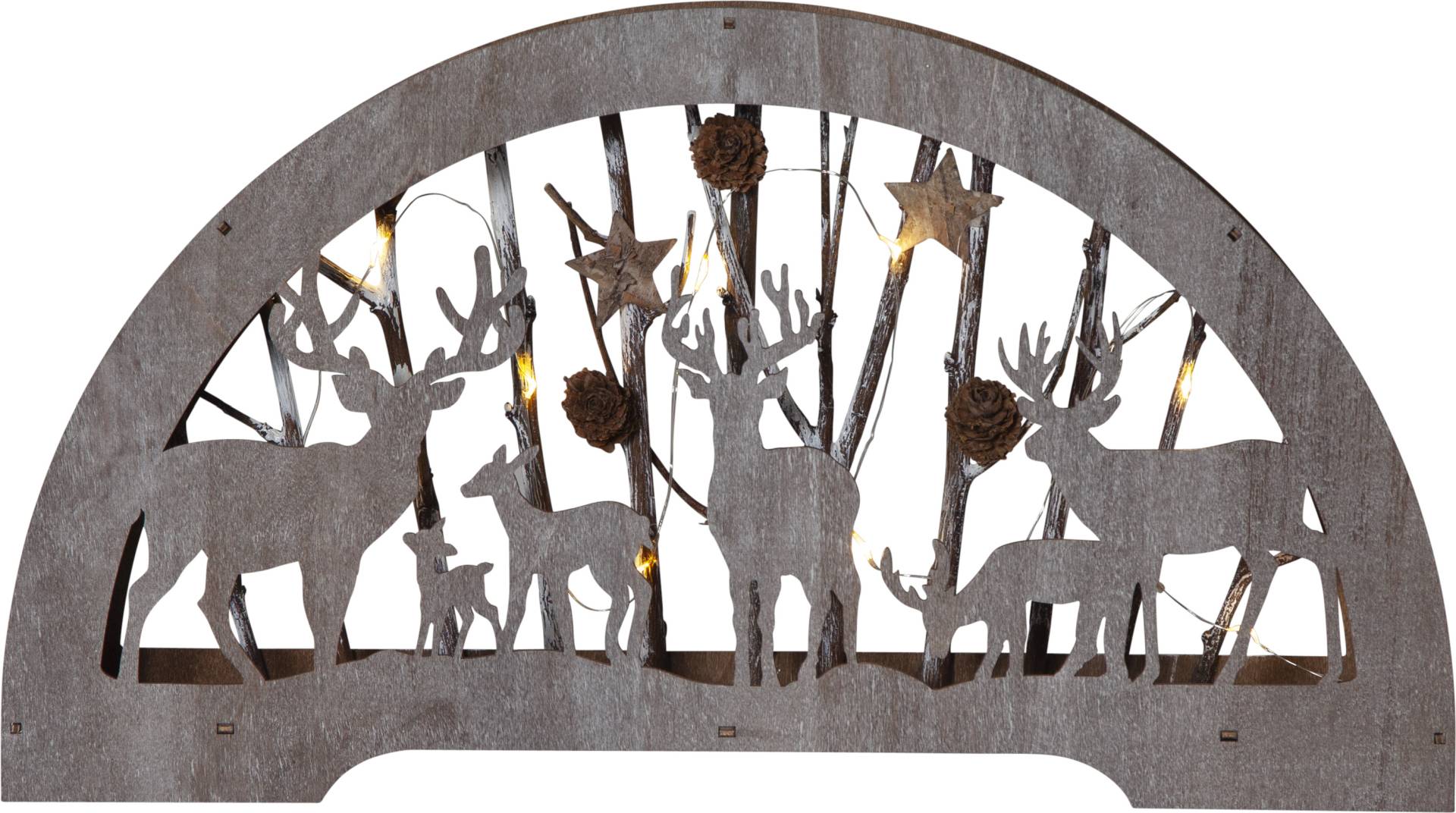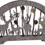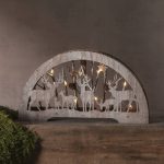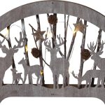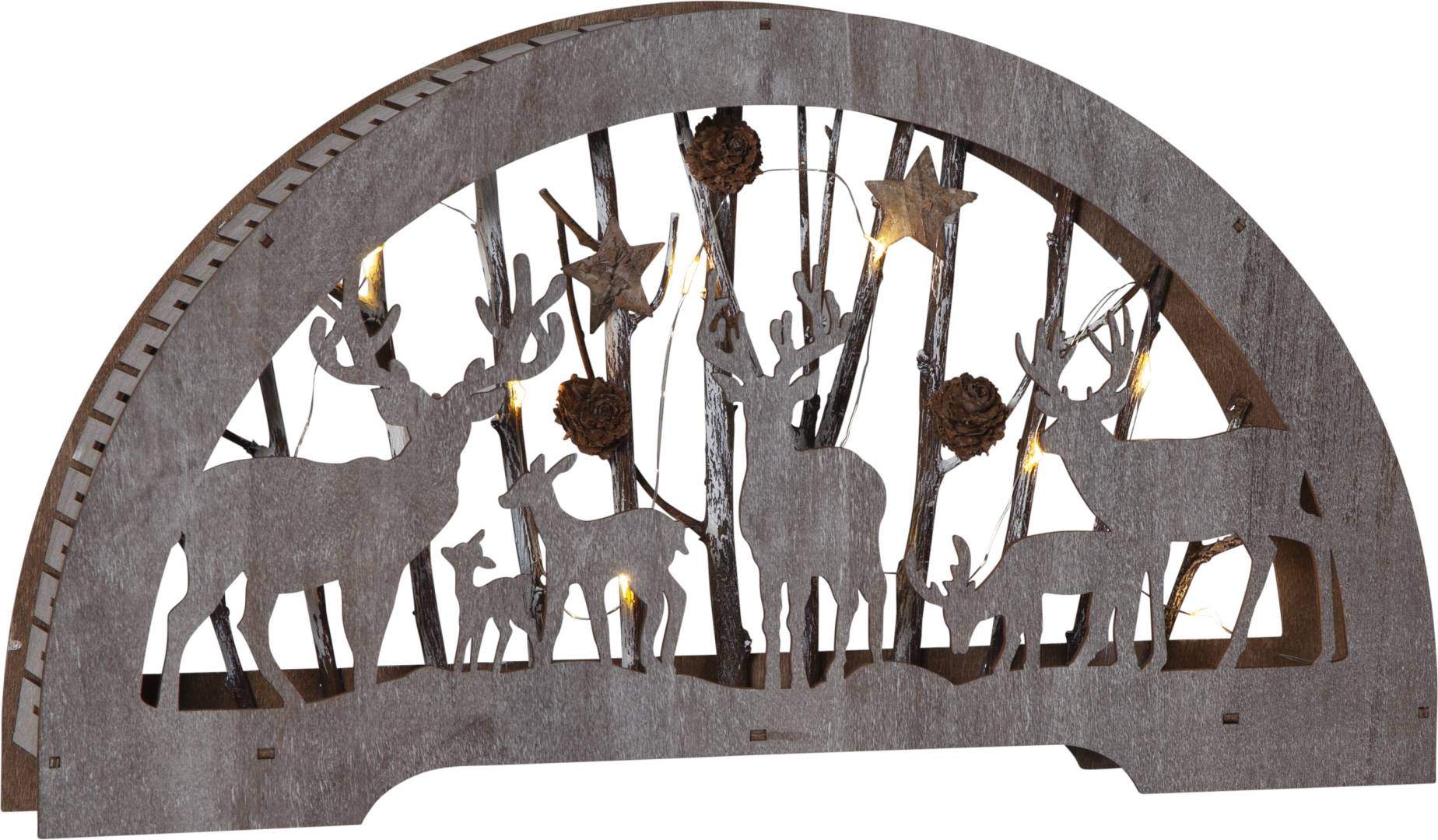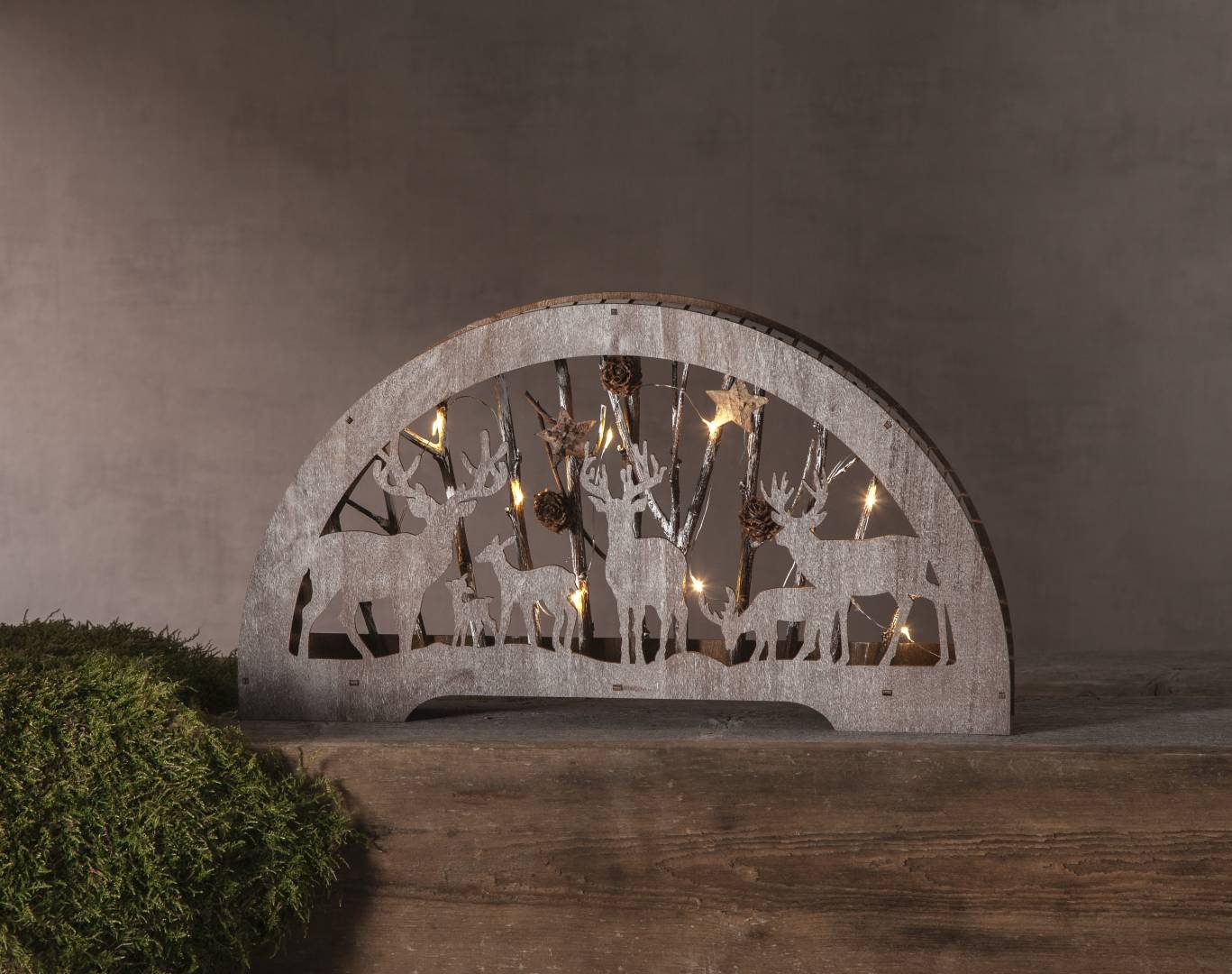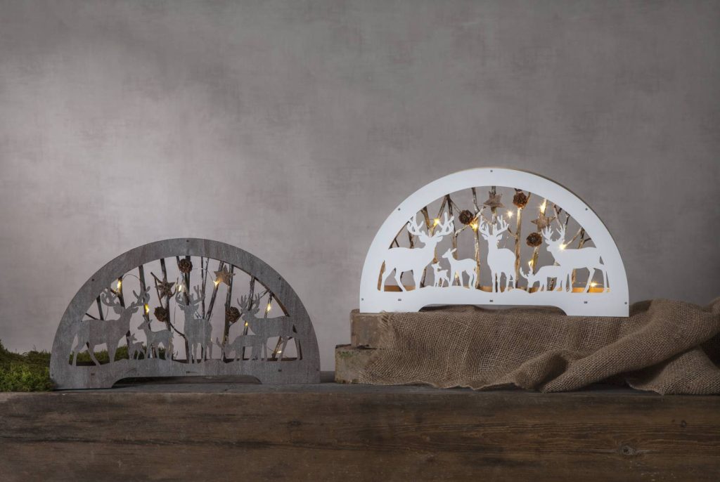 Sisäkäyttöön sopiva pöytäkoriste laserleikattua puuta. Tunnelmallista valoa luovat 10 lämpimän valkoista LED-lamppua.