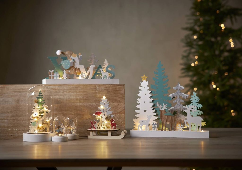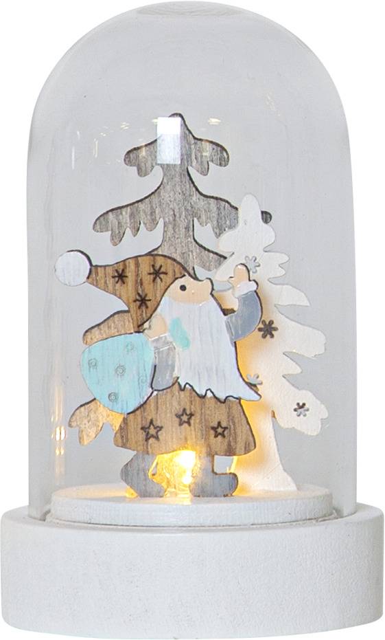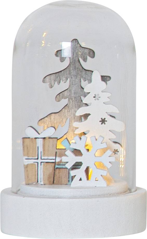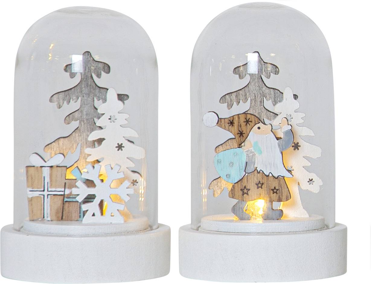 Kaksi pöytäkoristetta, joissa lasikuvun sisällä on puiset koristeet ja pienet LED-lamput lämpimän valkoisella valolla. Sisäkäyttöön.