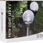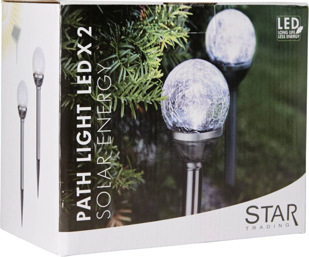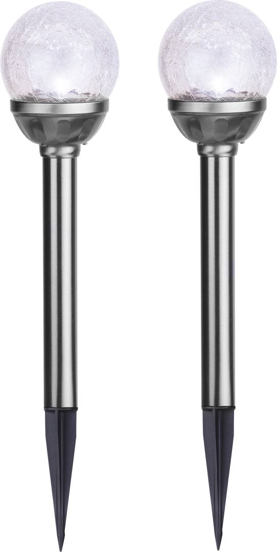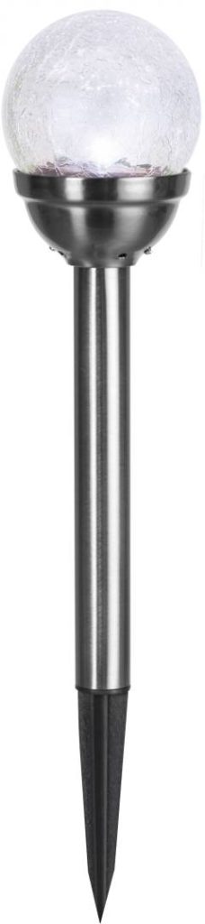 Aurinkokennolla toimiva 26,5 cm korkea pollari, jossa on krakleeratun lasipallon sisällä kylmä valkoinen LED-valo. Sopii esimerkiksi sisäänkäynnin läheisyyteen, kulkureittien varrelle tai puutarhaan. Pakkaus sisältää kaksi valaisinta.