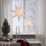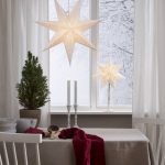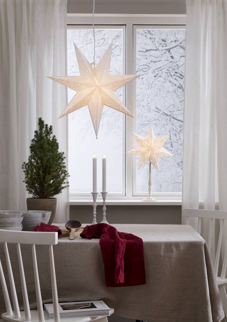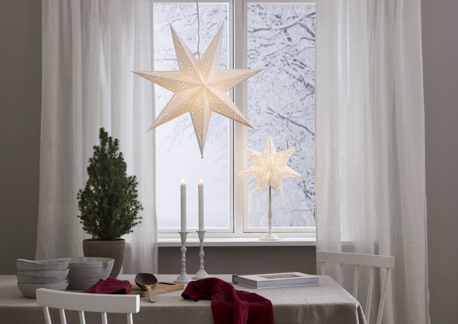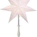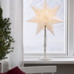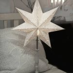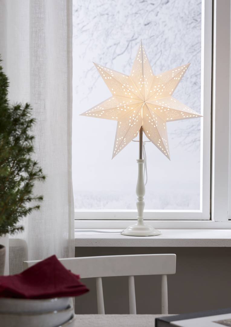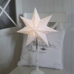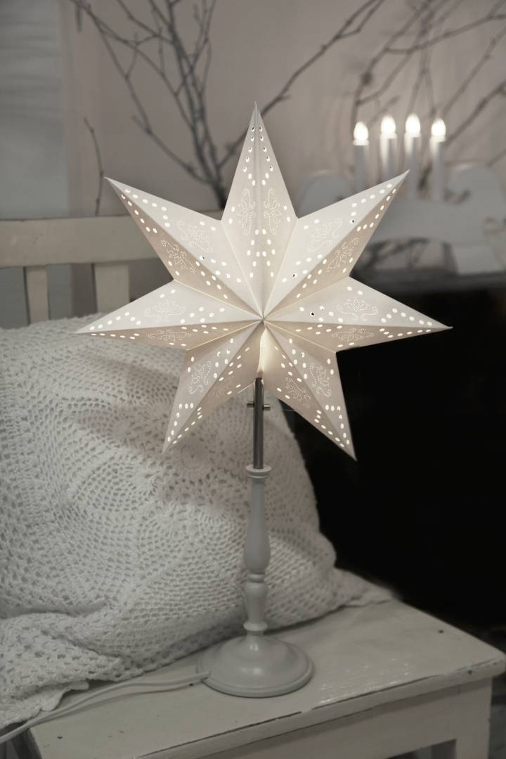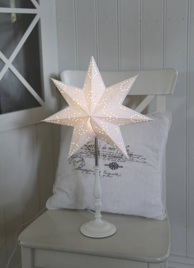 Paperinen pöytätähti, jalka valkoista puuta/metallia.