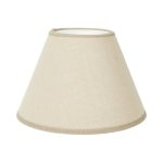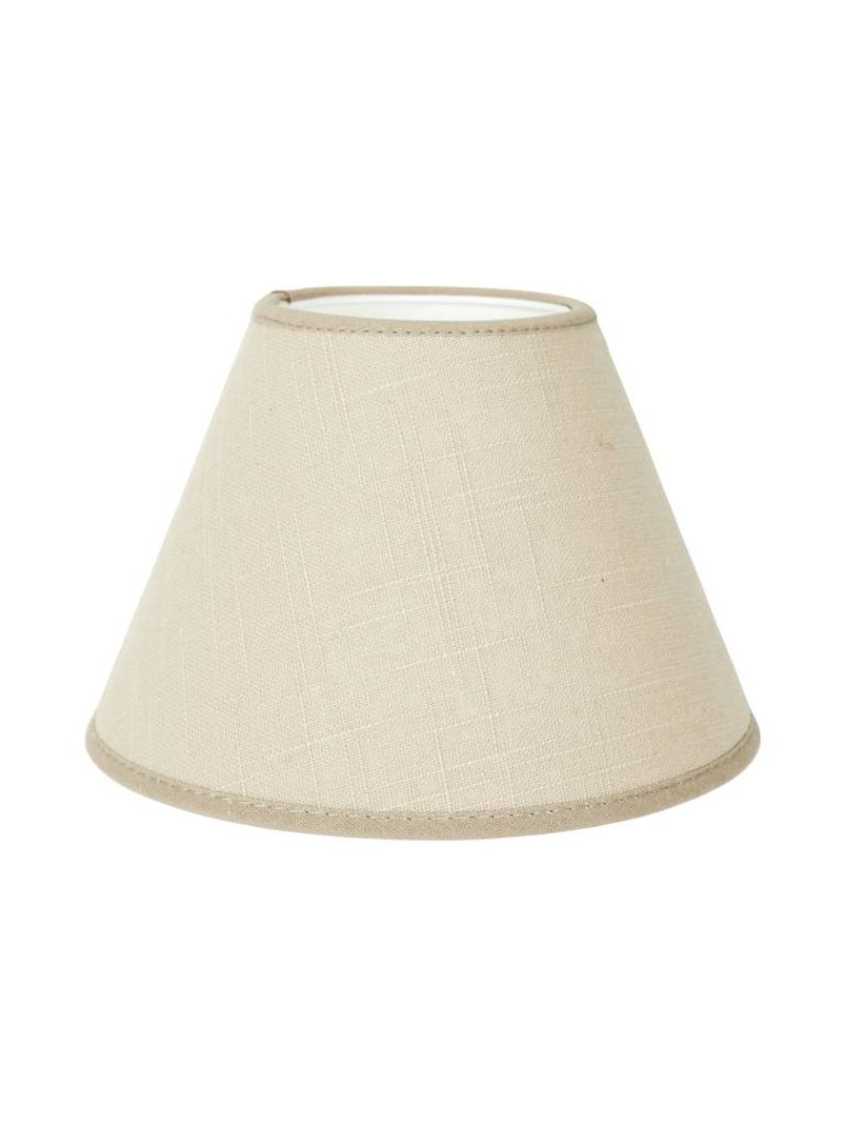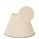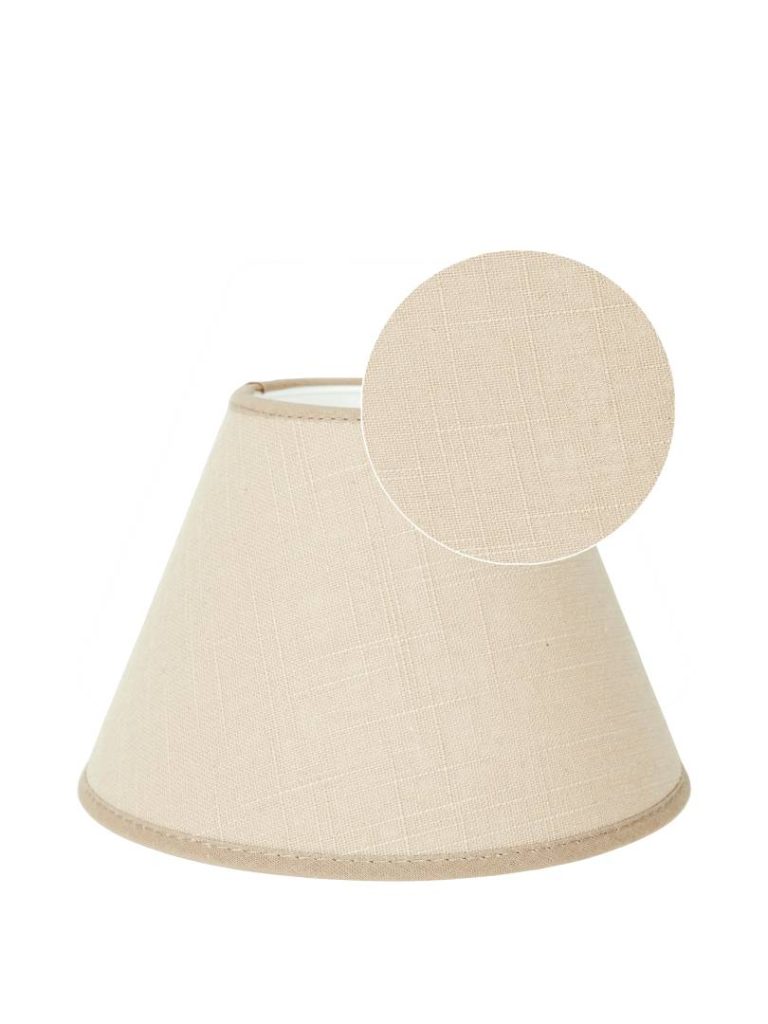 Kartiomainen lampunvarjostin puuvillakangasta. Kankaassa on elävä, pellavakankaan rakennetta muistuttava pinta. Valkoinen sisäpinta ja reunusnauha.