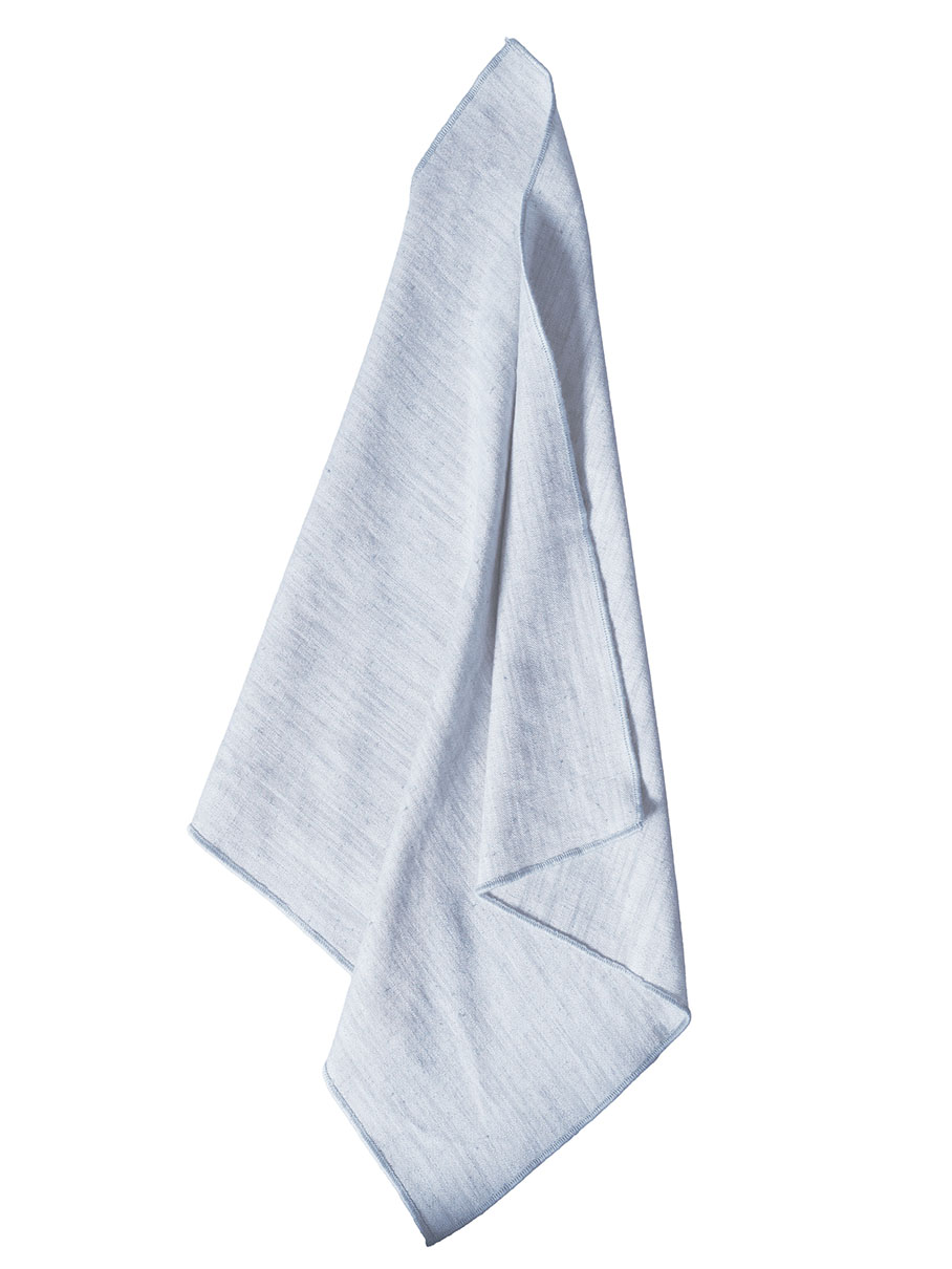 Keittiöpyyhe Chambray-puuvilla-pellavasekoitekangasta. Pyyhkeen reunoissa on koristekanttaus.