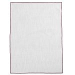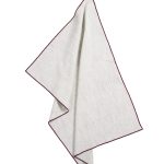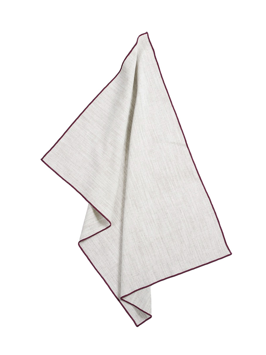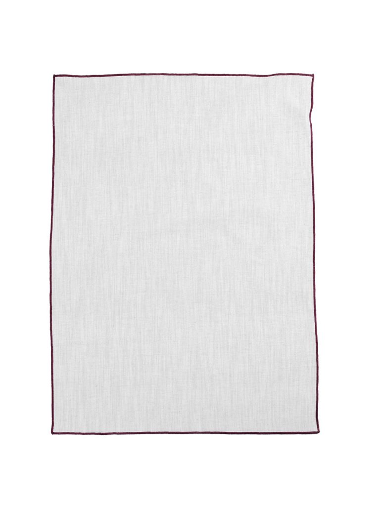 Keittiöpyyhe Chambray-puuvilla-pellavasekoitekangasta. Pyyhkeen reunoissa on kanttaus talvisen viininpunaisessa sävyssä.