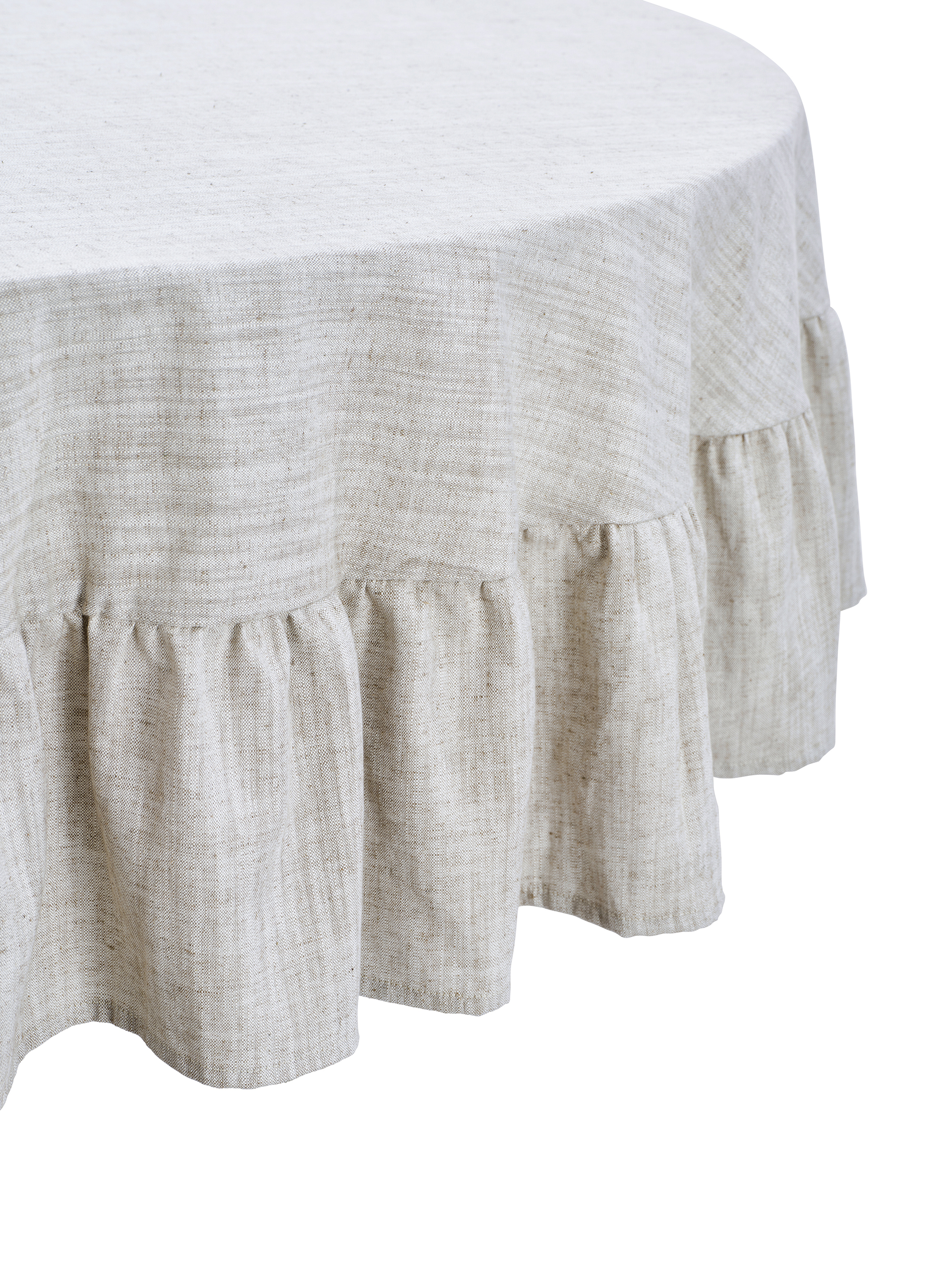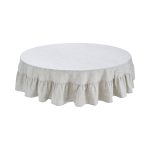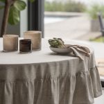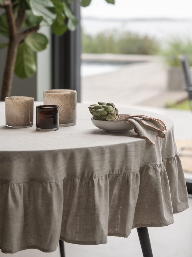 Pyöreä pöytäliina Chambray-puuvillakangasta, jossa on 10% pellavaa. Viimeistele kattaus yhteensopivissa kangasserveteillä ja alusliinalla.