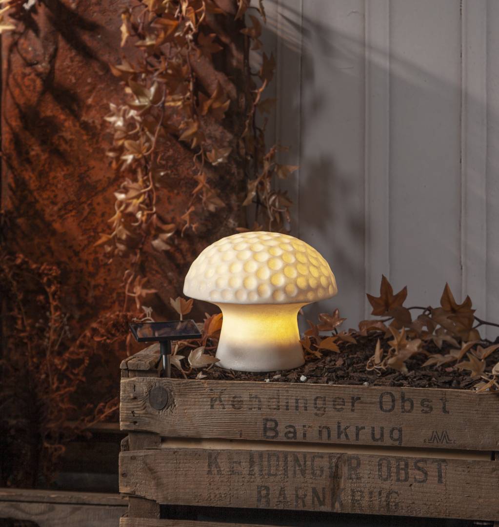 Hiekkakivestä ja polyresiinistä valmistettu aurinkokennolla toimiva koristesieni lämpimän valkoisella LED-valolla. Sopii puutarhaan, terassille tai parvekkeelle koristevalaisimeksi.