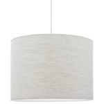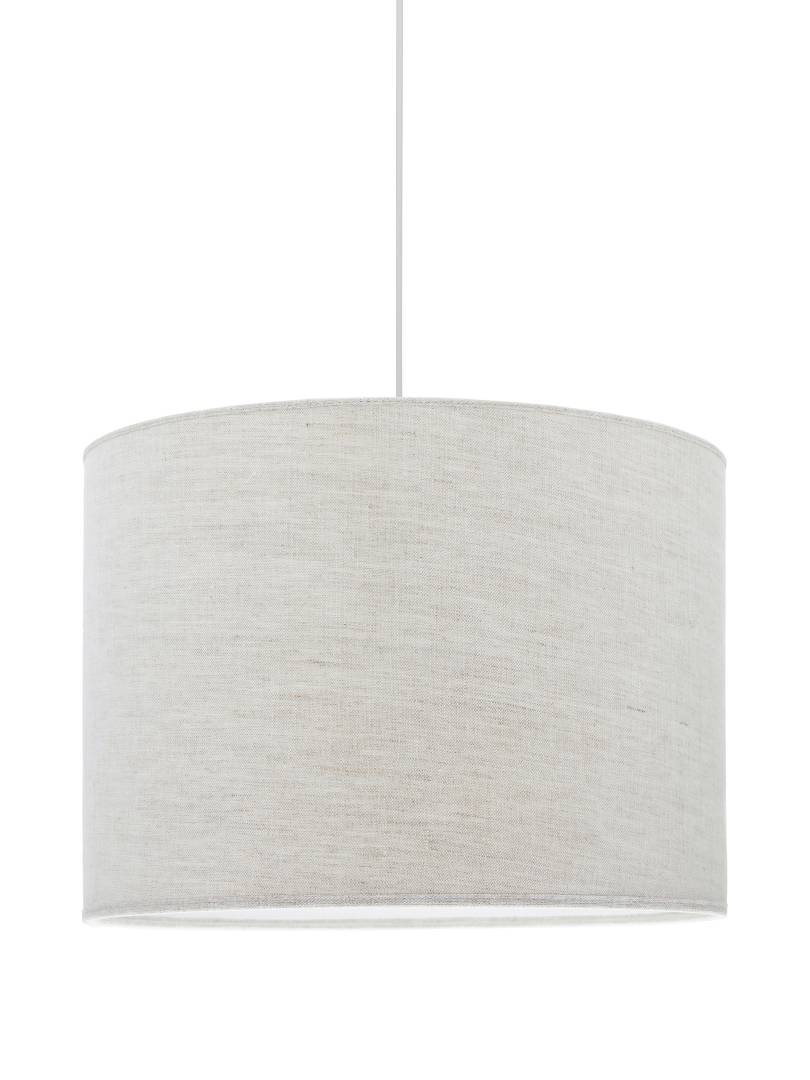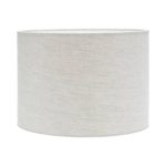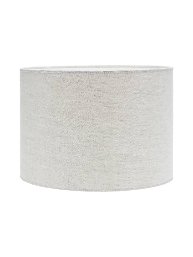 Matala sylinterin muotoinen pelkistetty pellavavarjostin, joka sopii moniin lampunjalkoihin ja kattovarjostimeksi.