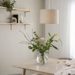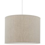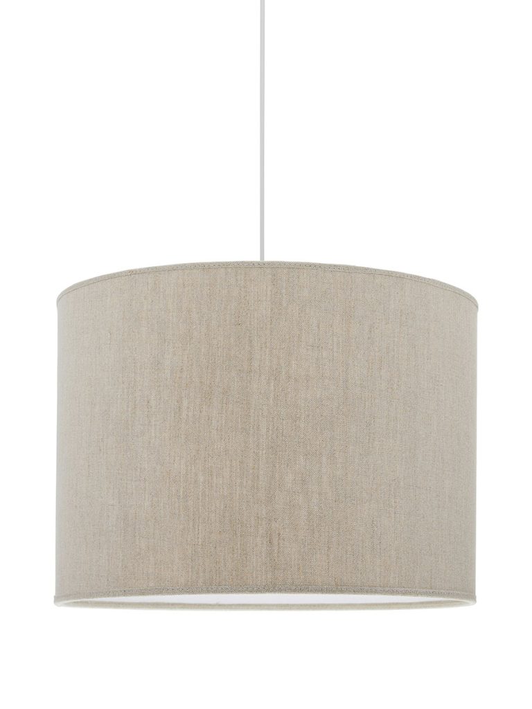 Riippuvalaisin matalalla sylinterin muotosella pelkistetyllä pellavavarjostimella. Pellavakangas antaa varjostimen elävän pinnan. Vaalea sisäpinta.
