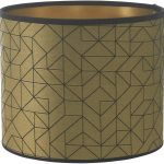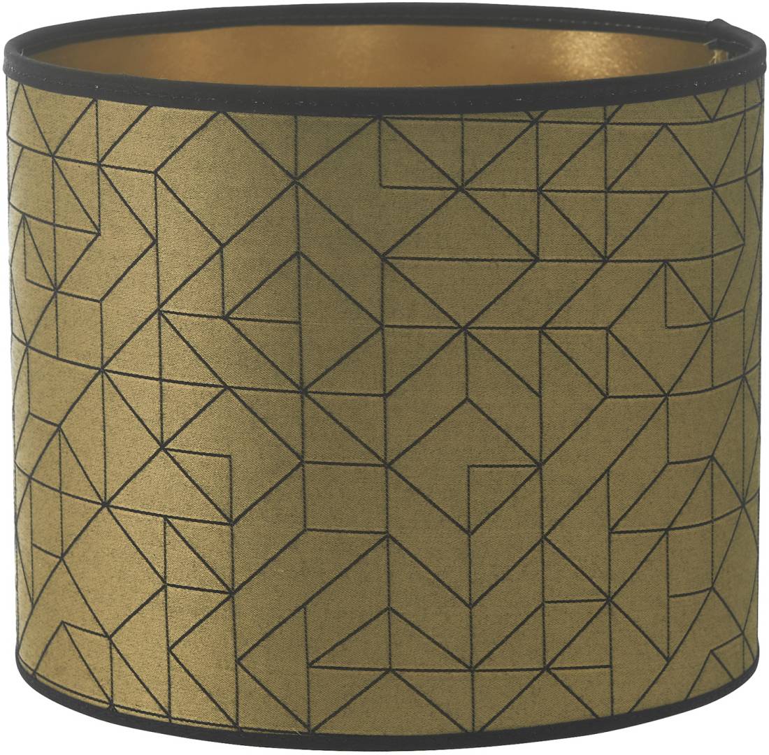 Matala sylinterin mallinen lampunvarjostin, jossa graafinen kuviointi ja kullanvärinen sisäpuoli.