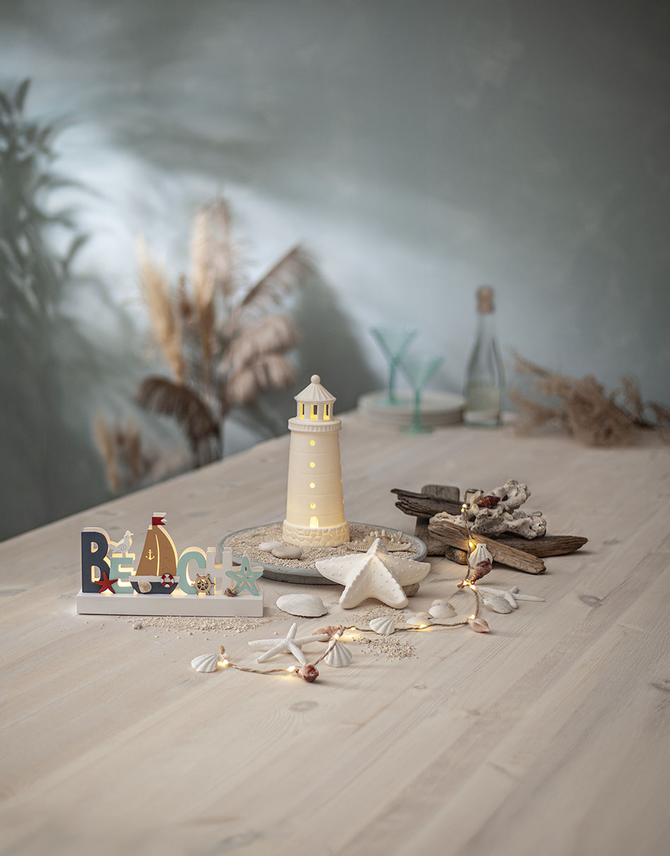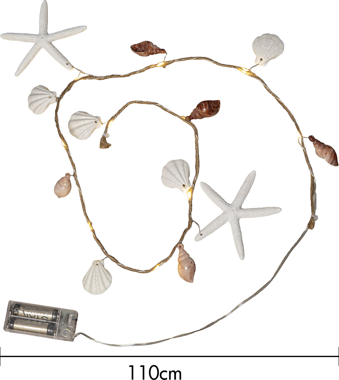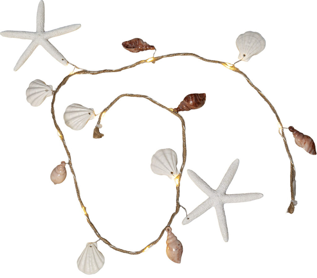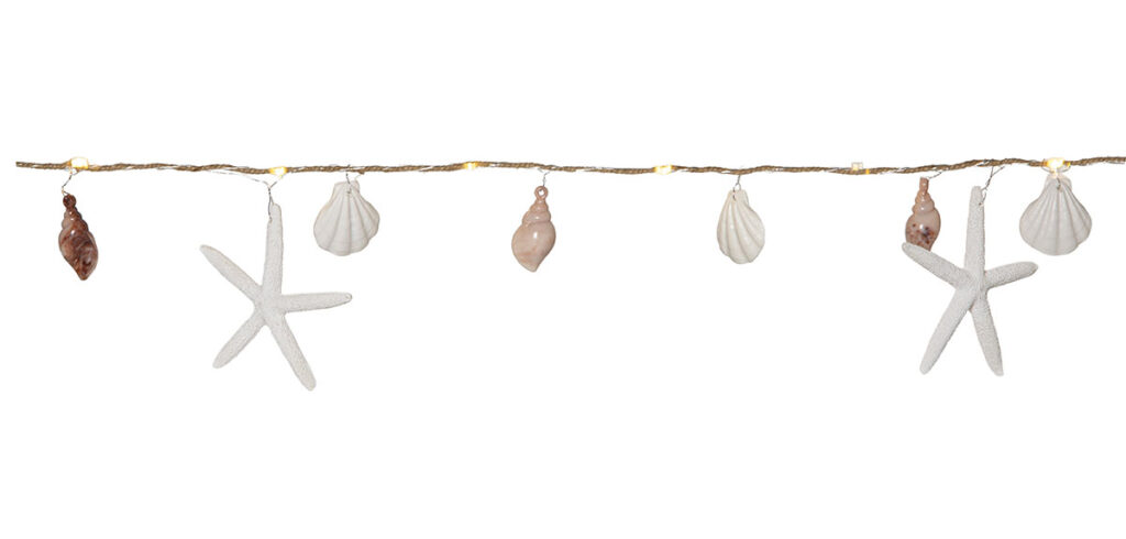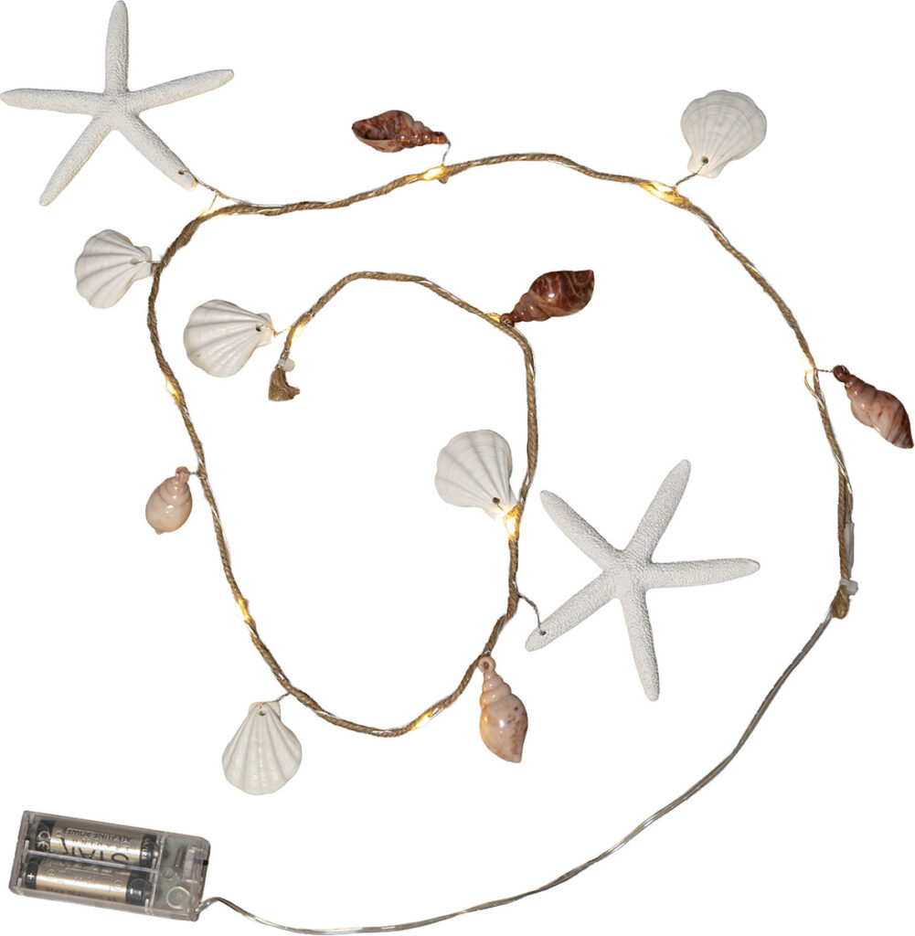 Sisäkäyttöön sopiva valosarja meriteemaisilla muovisilla näkinkengillä, simpukoilla ja meritähdillä. Valosarjassa on juuttinaru kiedottuna ohuen metallikaapelin ympärille ja 10 lämpimän valkoista LED-valopistettä.