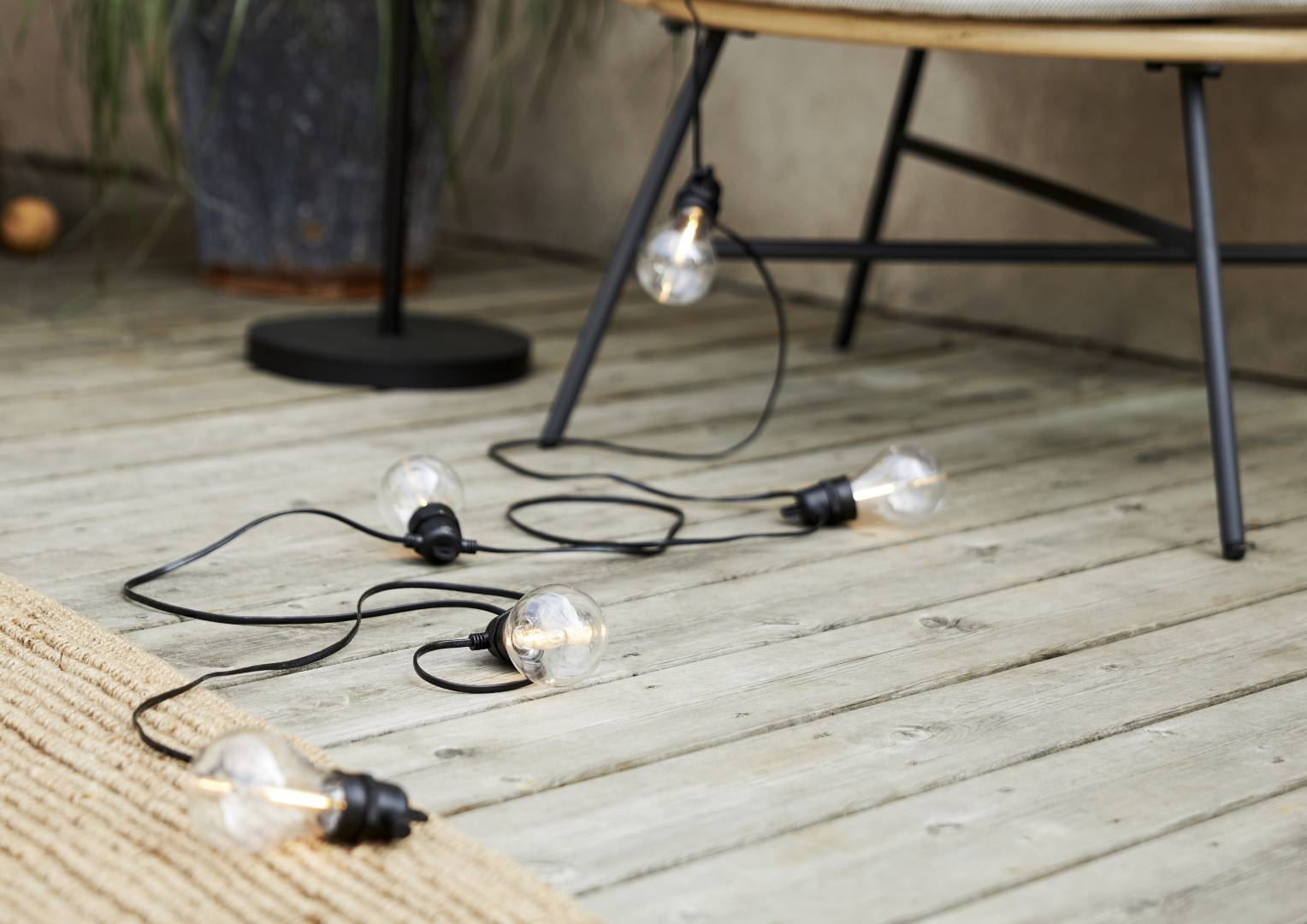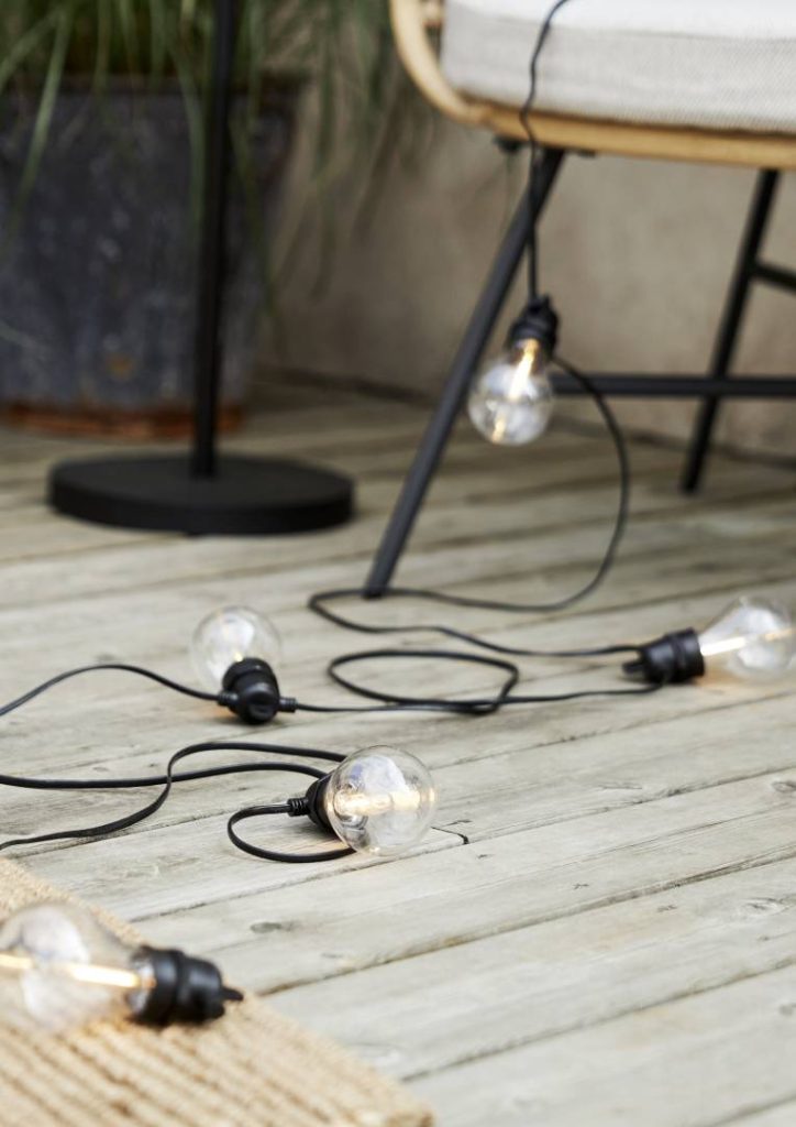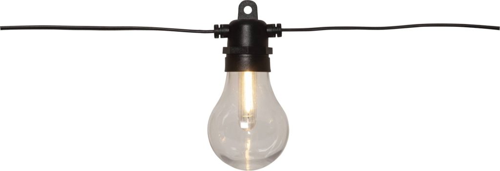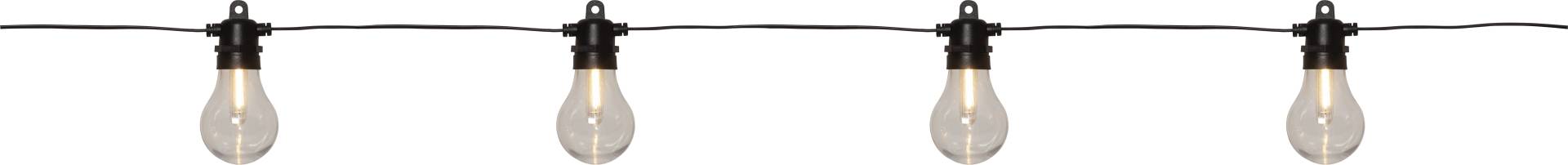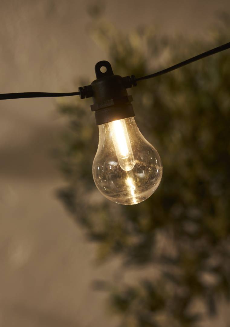 Ulko- ja sisäkäyttöön sopiva valosarja 10 kirkkaalla muovikuvulla, joiden sisällä on vaihdettavat E12-kantaiset filamentti-LED-lamput. Lampuissa on lämpimän valkoinen valo. Kaapeli on väriltään musta.