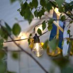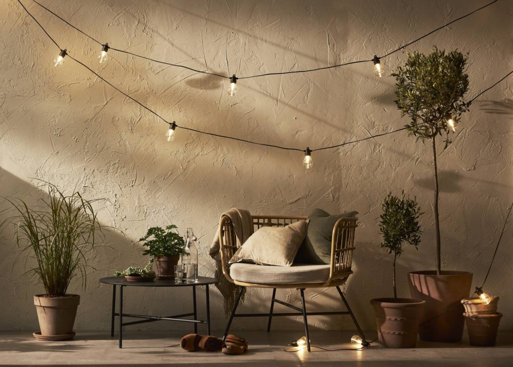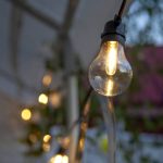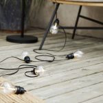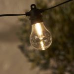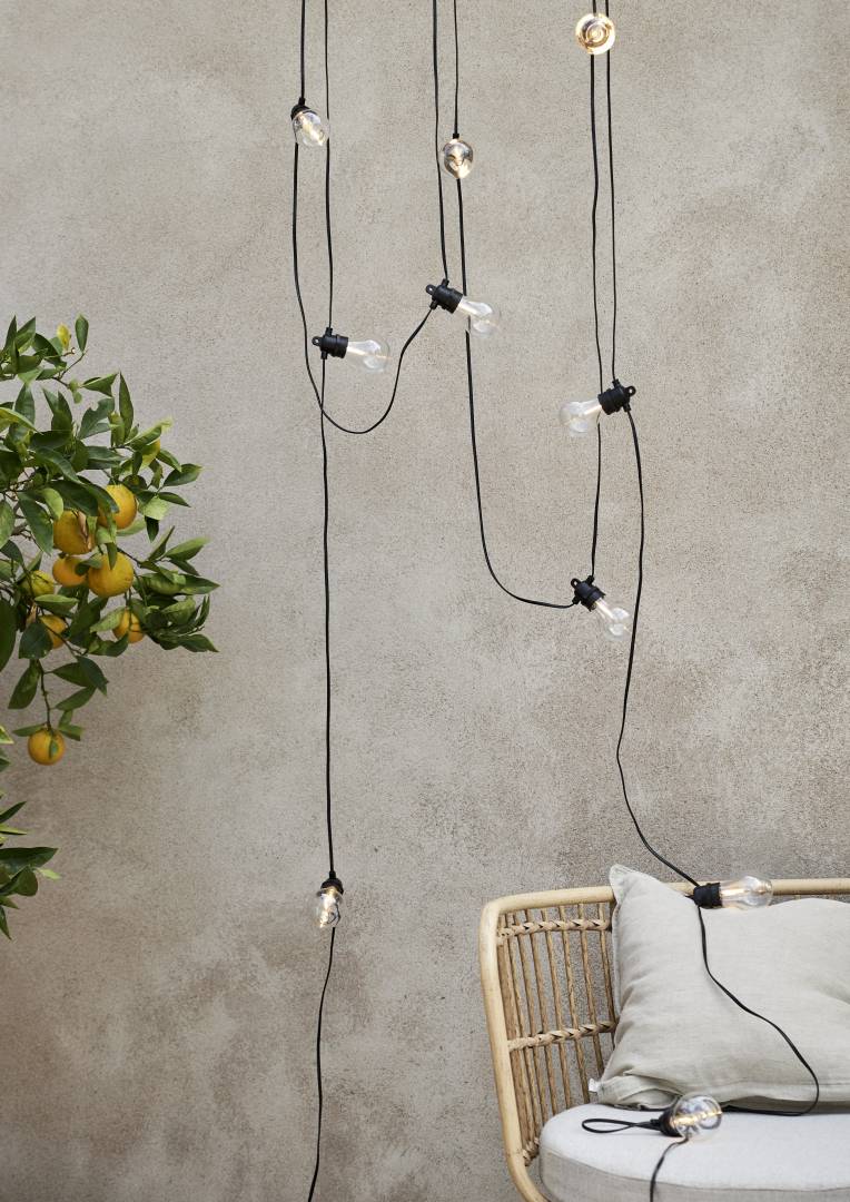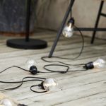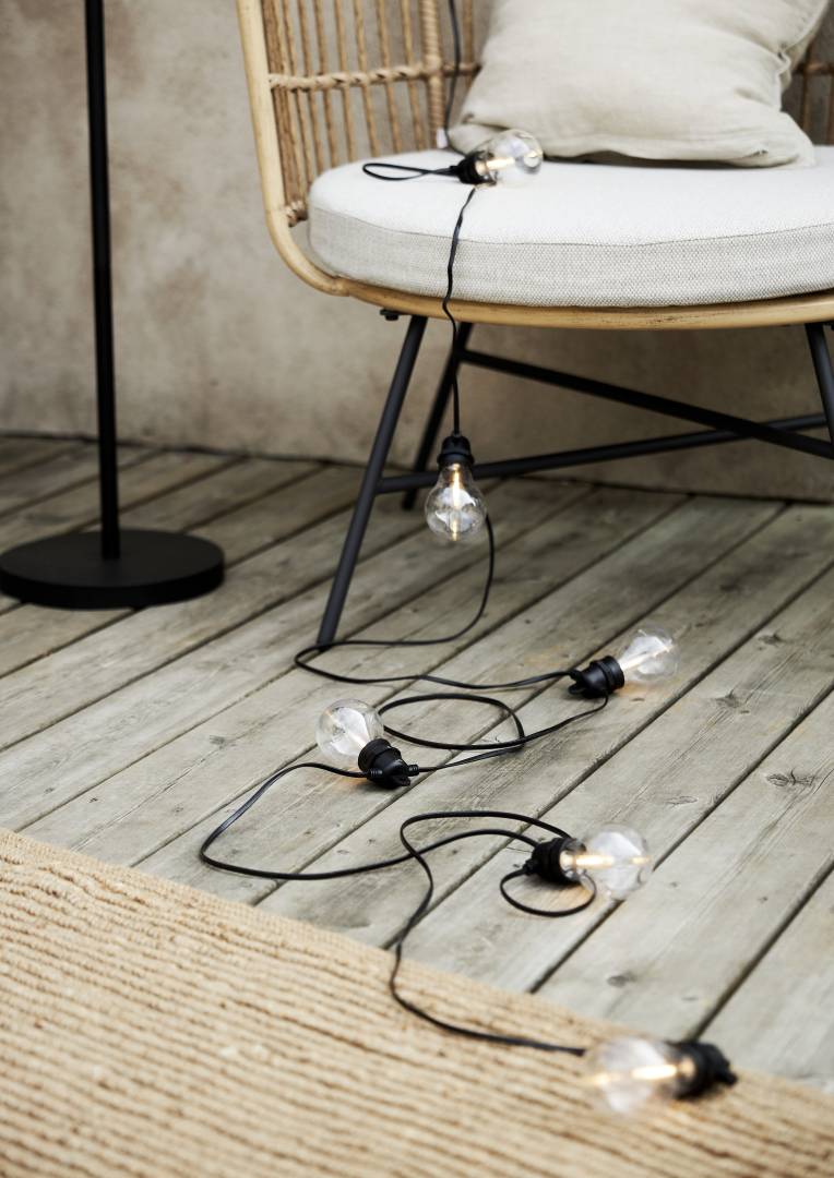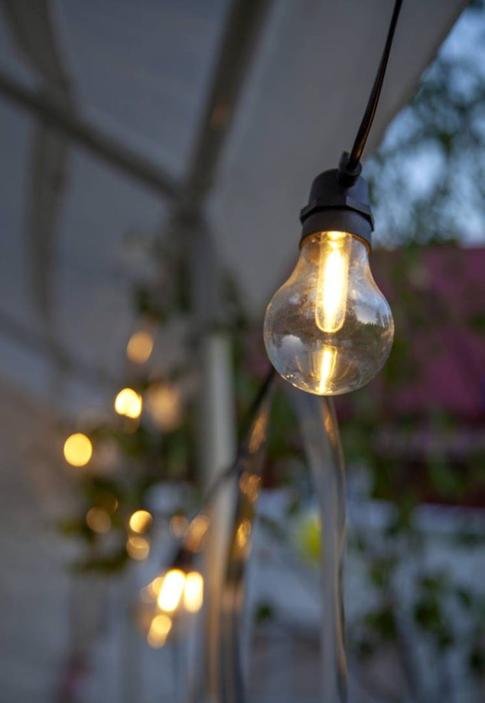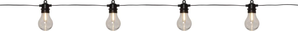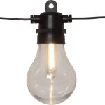 Ulko- ja sisäkäyttöön sopiva valosarja 10 kirkkaalla muovikuvulla, joiden sisällä on vaihdettavat E12-kantaiset filamentti-LED-lamput. Lampuissa on lämpimän valkoinen valo. Kaapeli on väriltään musta.