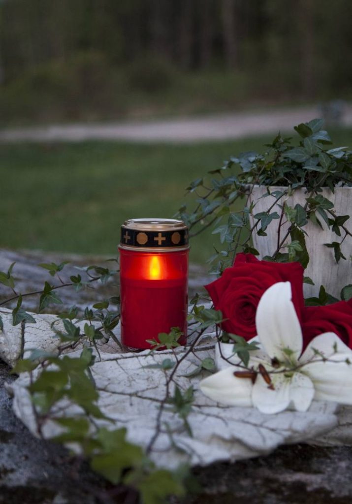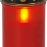 Paristoilla toimiva punainen hautakynttilä, jossa loistaa lämpimän valkoinen LED-liekki.
