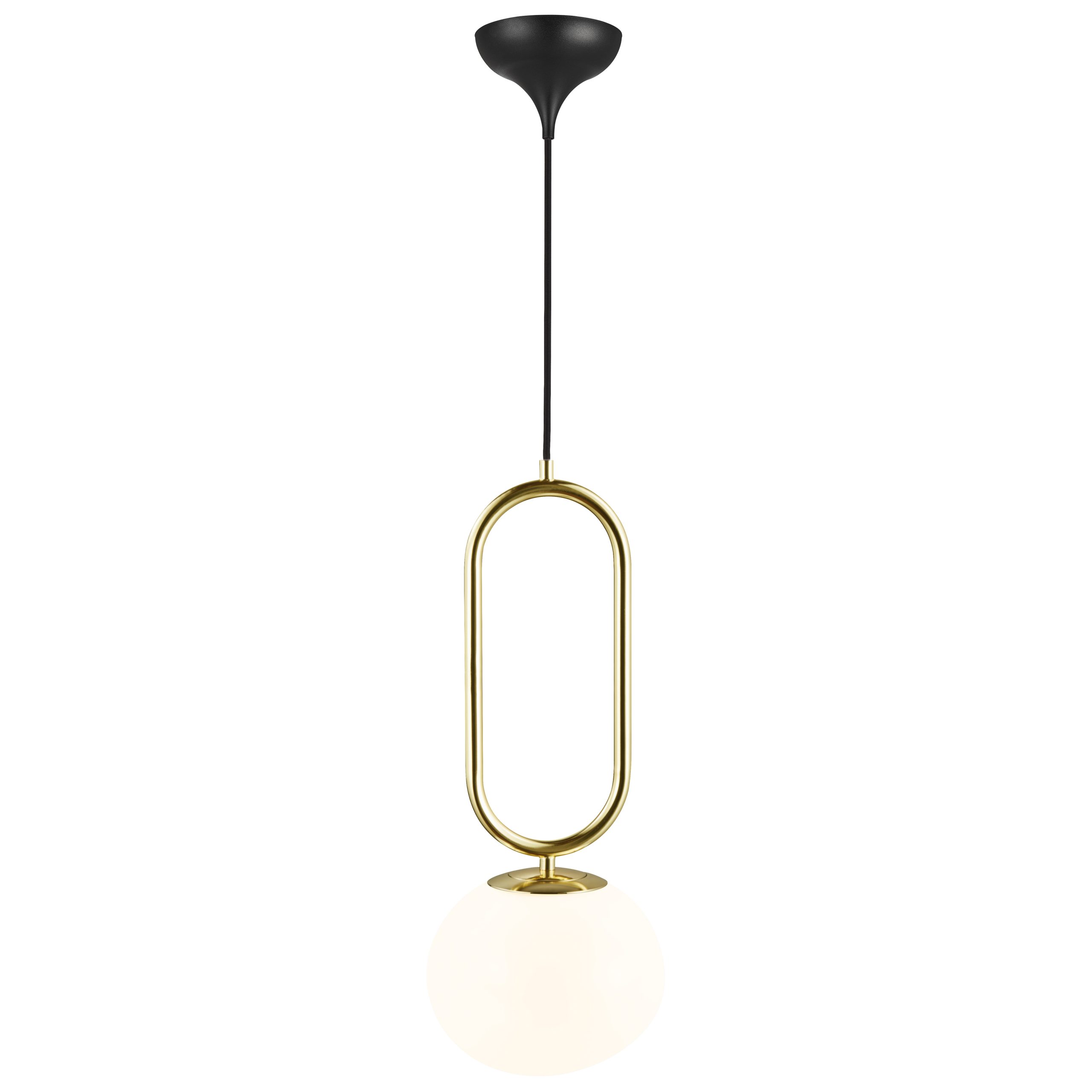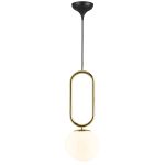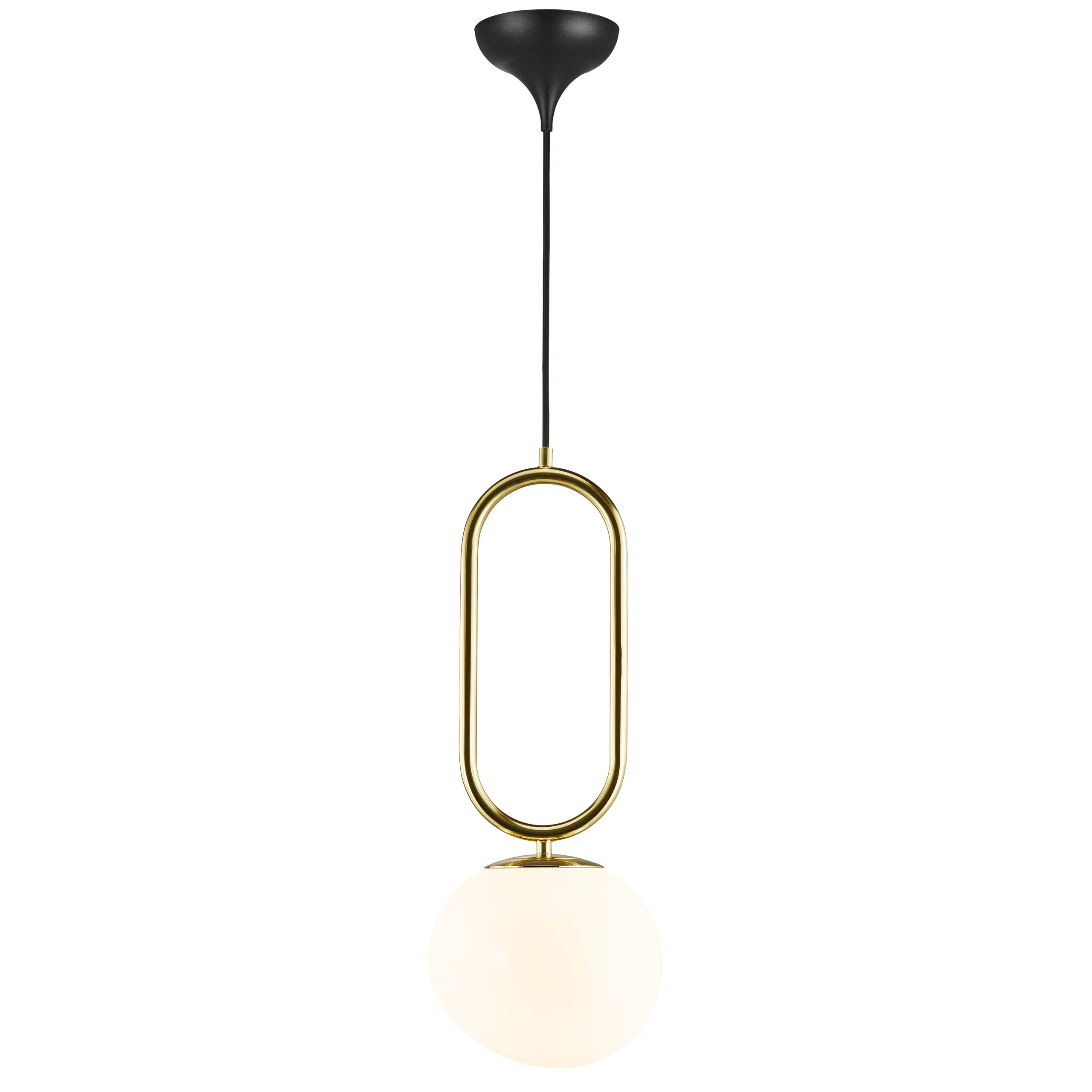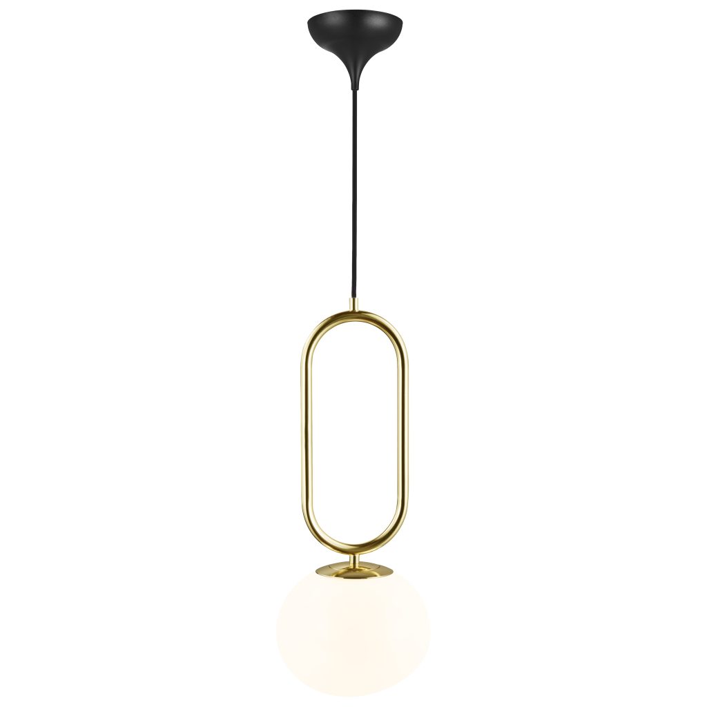 Kaunis riippuvalaisin messinkiä, varjostin on suupuhallettua opaalivalkoista lasia ja muodoltaan epäsymmetrinen.