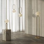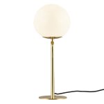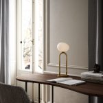 Kaunis pöytävalaisin messinkiä, varjostin on suupuhallettua opaalivalkoista lasia ja muodoltaan epäsymmetrinen.