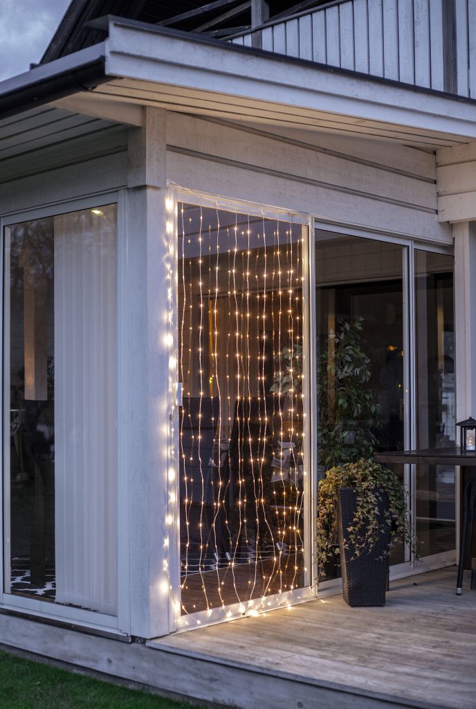 Ulkokäyttöön sopiva 1x2m valoverho, jossa 10 läpinäkyvää nauhaa, jokaisessa 20 pientä lämpimän valkoista LED-valopistettä. Valaise ulkotila, juhlateltta tai vaikkapa seinä tunnelmallisella valolla!