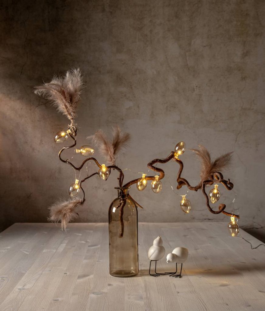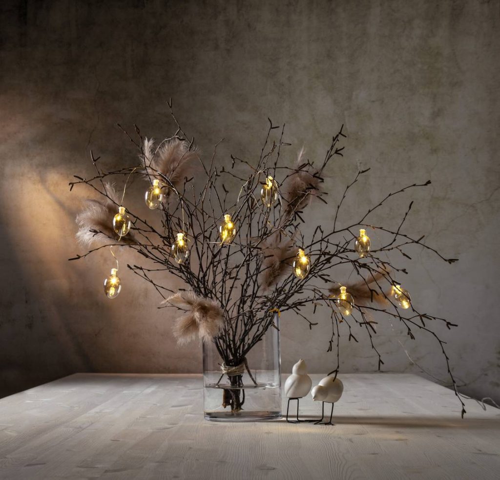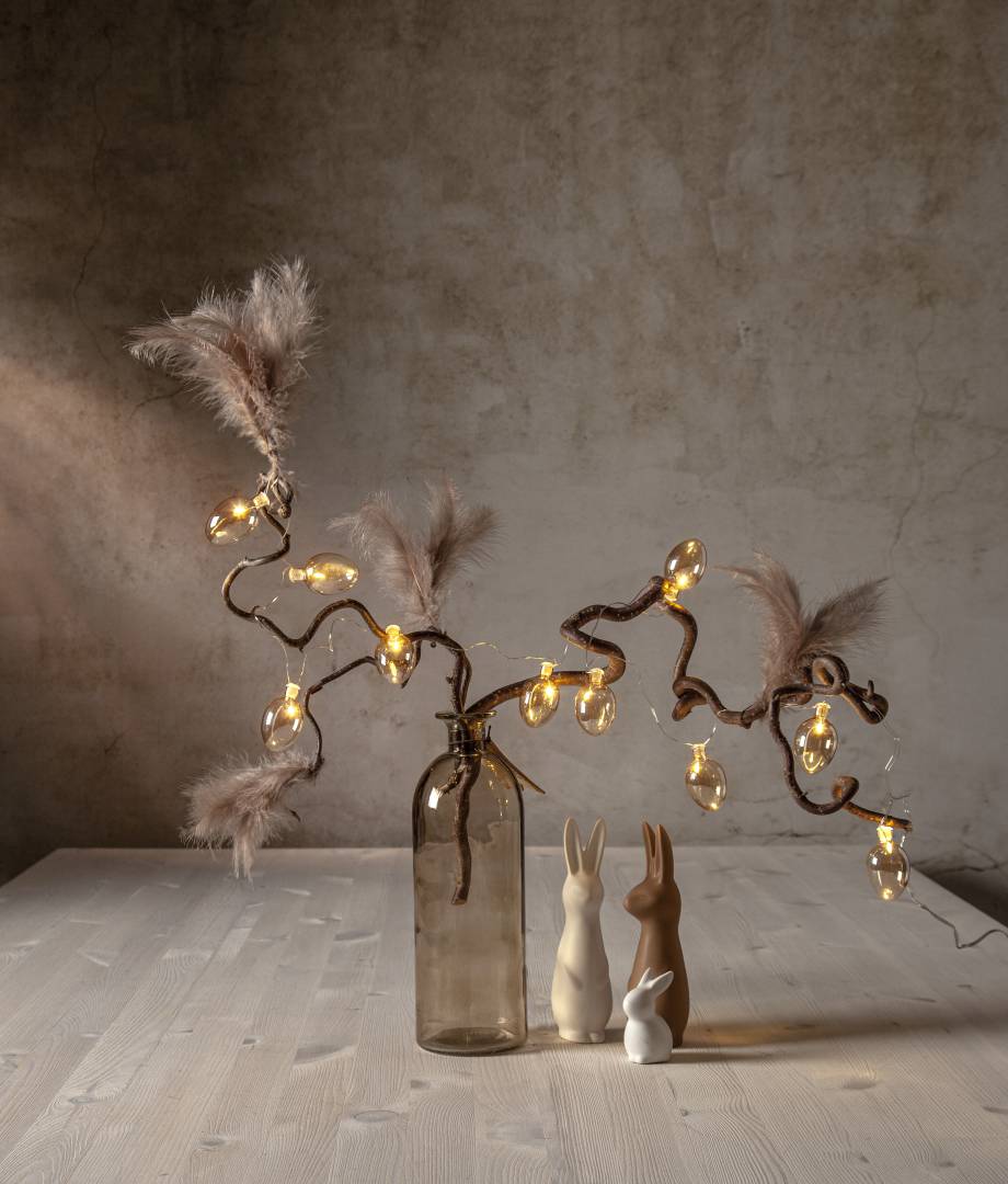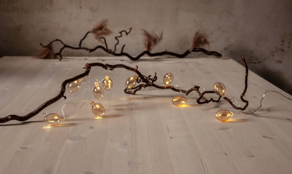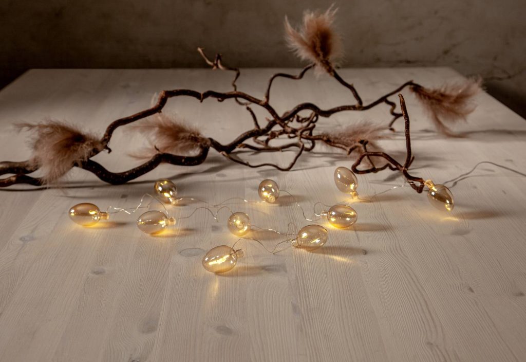 Kaunis sisäkäyttöön sopiva valosarja, jossa on koristeena beigen sävyiset lasimunat. Sopii esim. pääsiäiskoristuksiin ja -kattauksiin. Valon sävy: lämmin valkoinen.