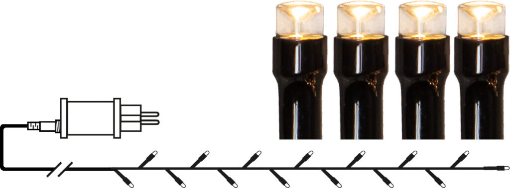 5,6 m pitkä valosarja, jossa on 80 pientä LED-lamppua 7 cm välein. Värisävy on lämmin valkoinen. Sopii monenlaiseen koristeluun ulkotiloissa.