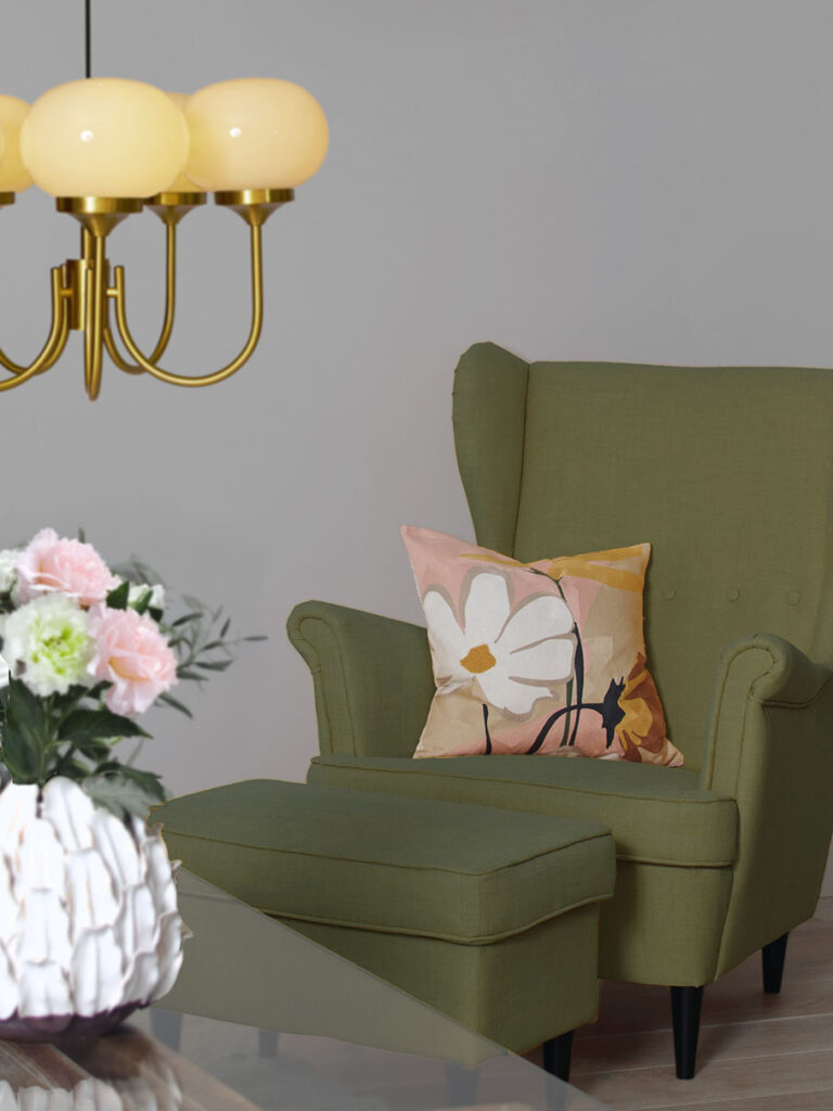 Puuvillainen tyynynpäällinen, jossa on etupuolella brodeeratut kuviot, taustapuoli yksiväristä puuvillaa. Vetoketju alareunassa.
