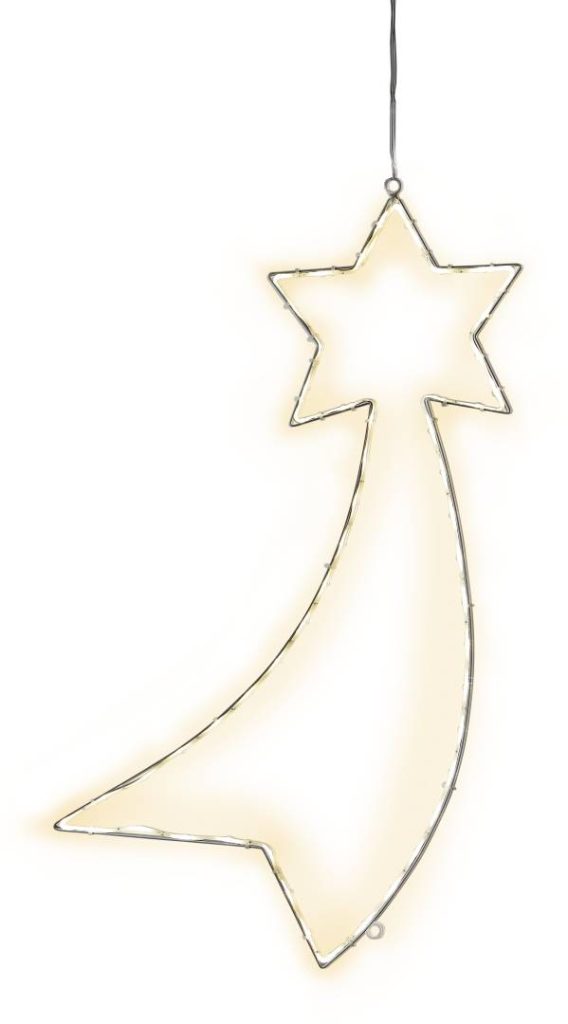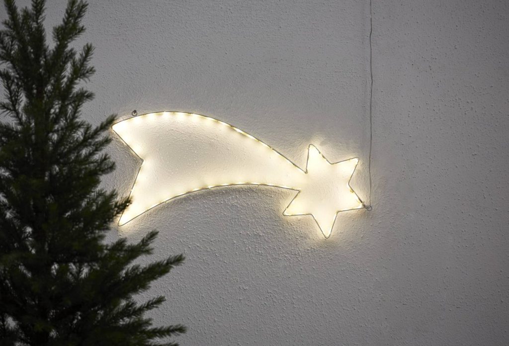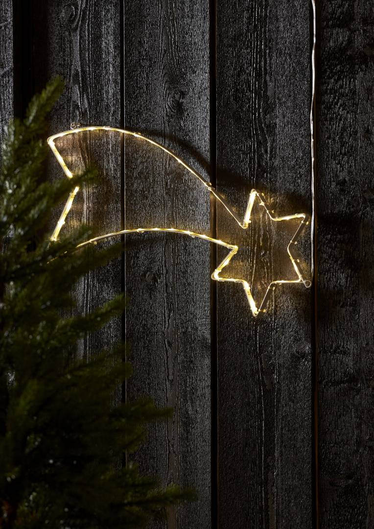 Tähdenlento-siluetti ulkokäyttöön. Sopii koristeeksi puutarhaan tai esimerkiksi talon julkisivua koristamaan. Siluetissa on 54 lämpimän valkoista LED-valoa.
