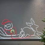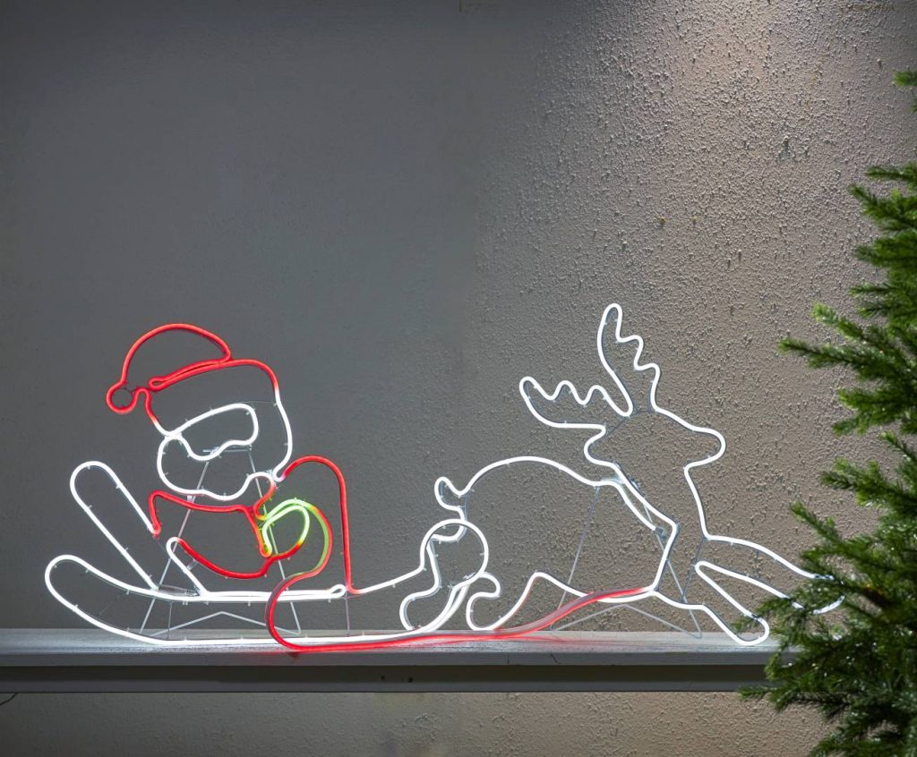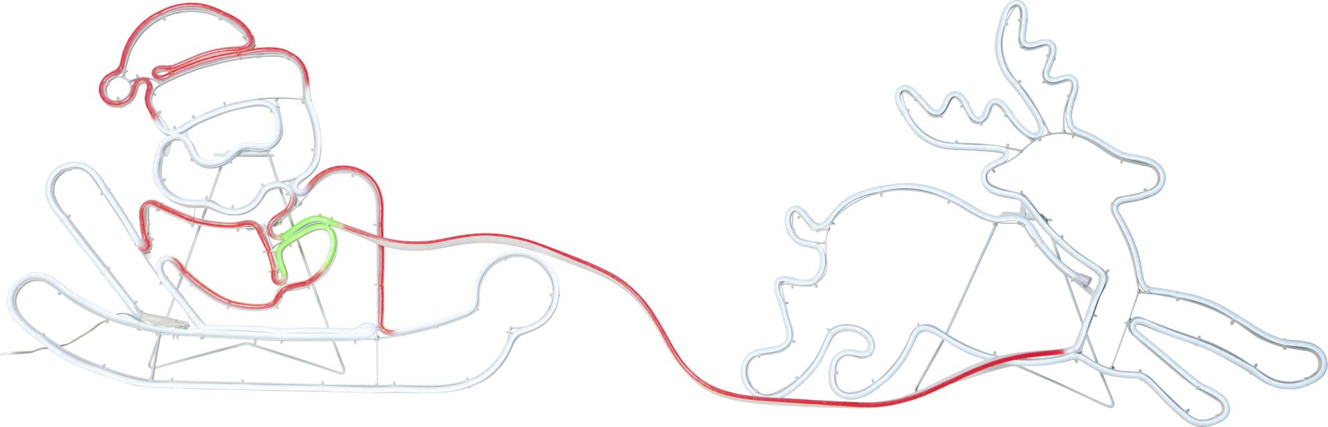 Joulupukki ja reki -siluetti ulkokäyttöön. Sopii joulunajan koristeeksi puutarhaan tai esimerkiksi talon julkisivua koristamaan. Siluetissa on 1008 moniväristä LED-valoa.
