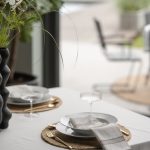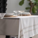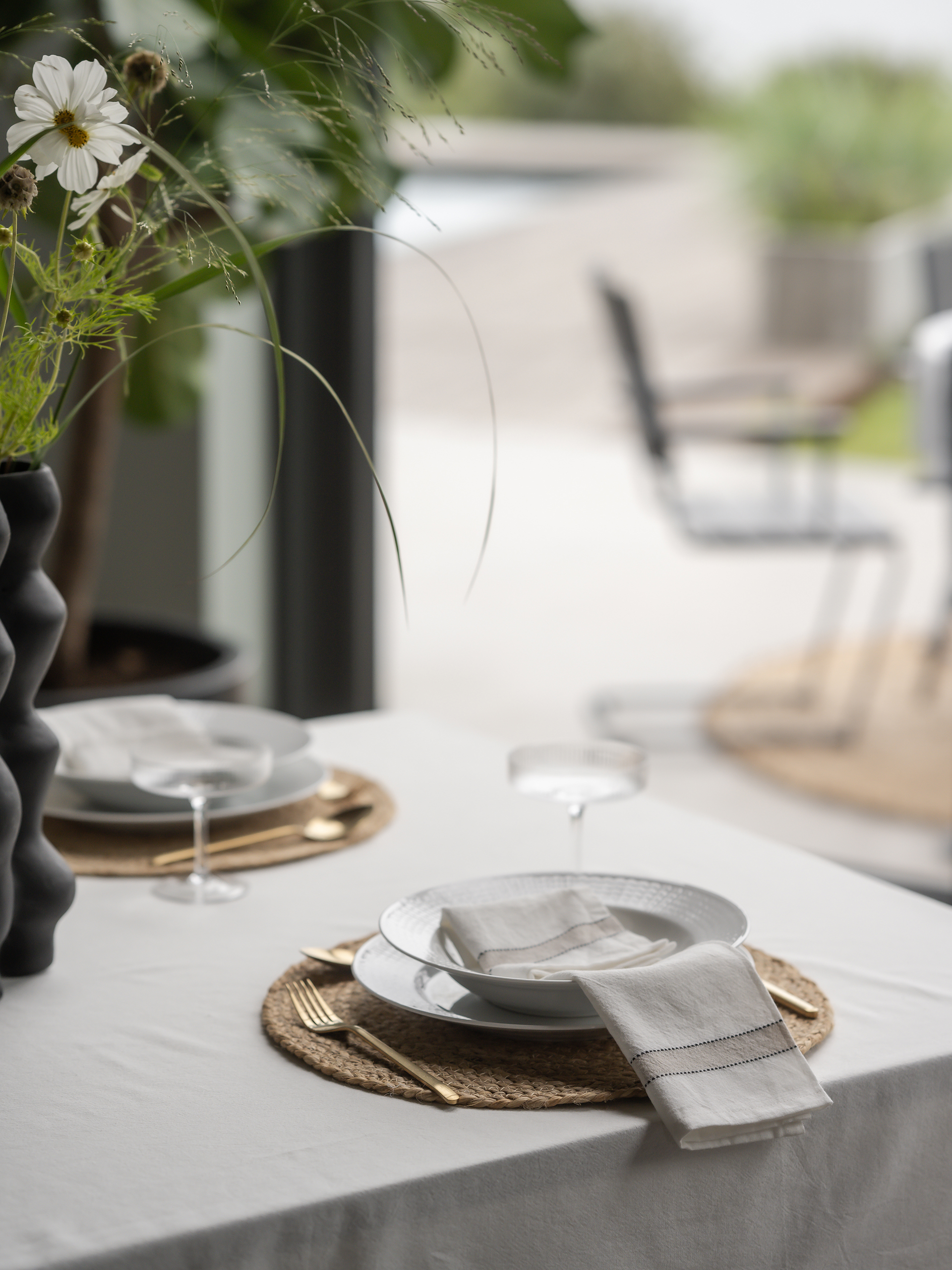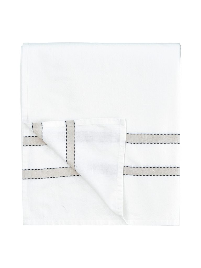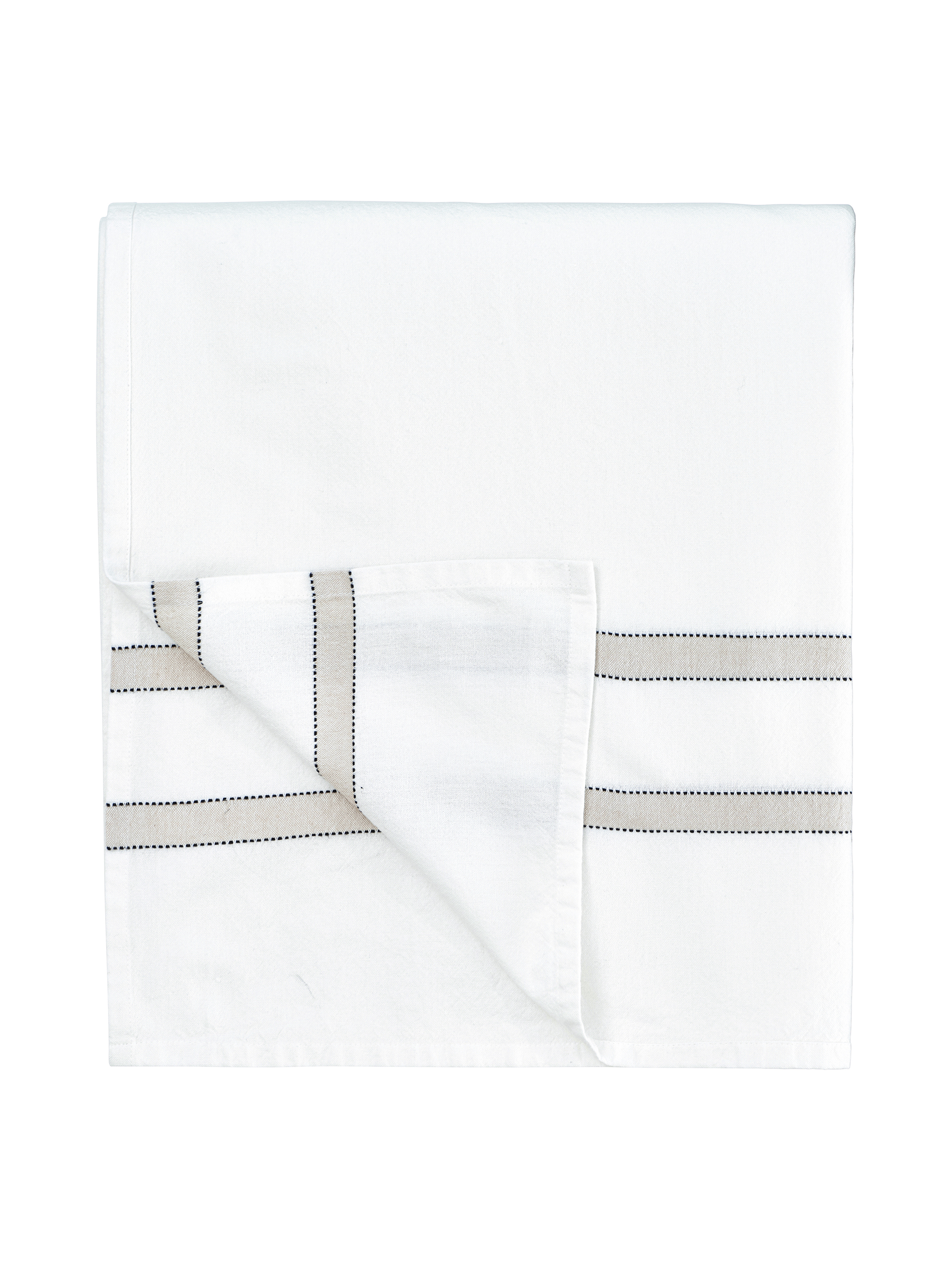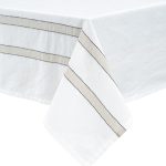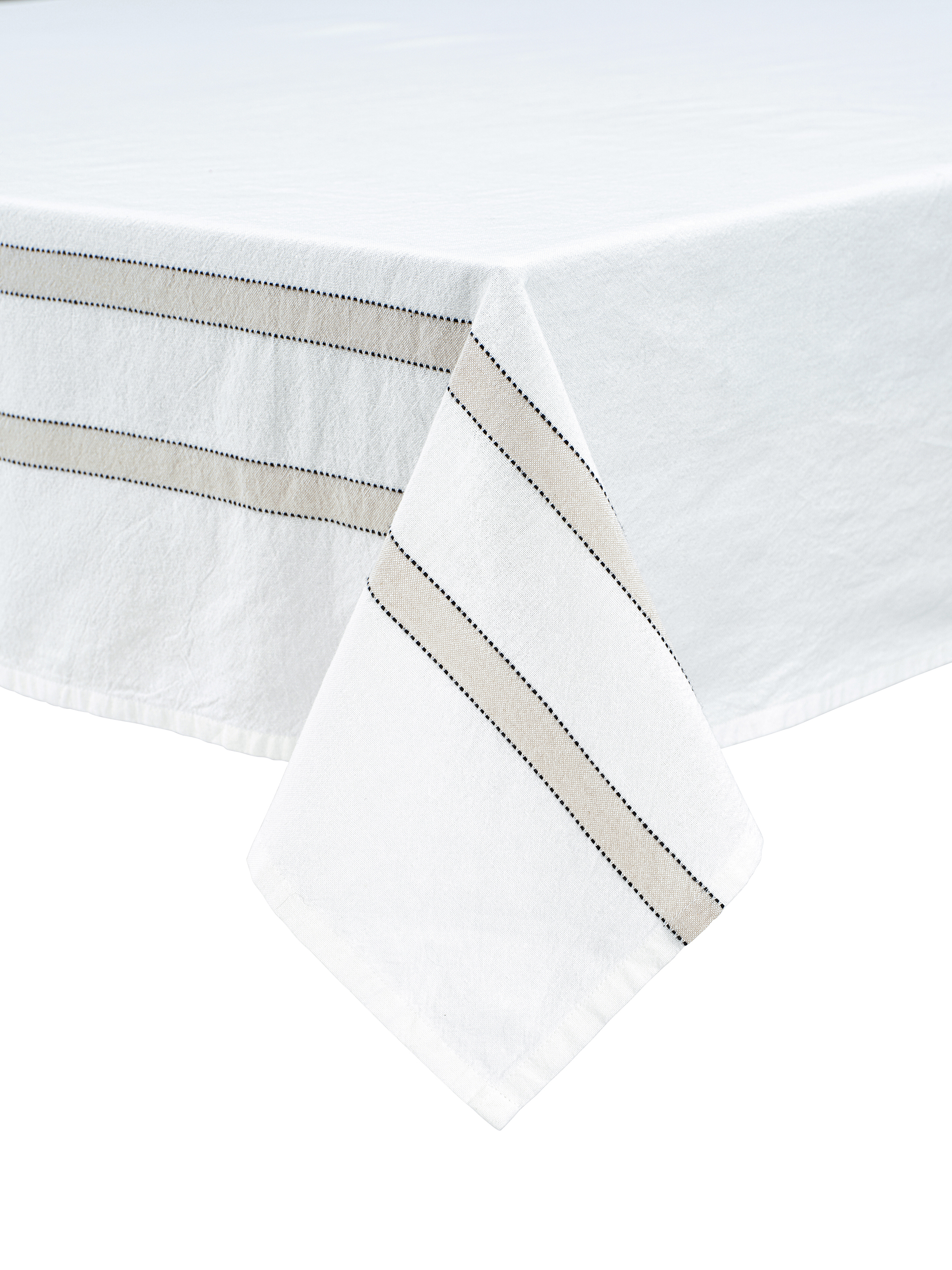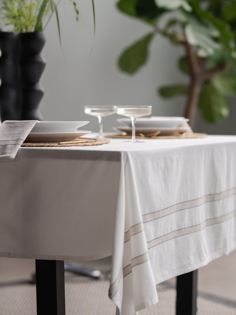 Pöytäliina pestyn tuntuista pehmeää puuvillaa, lankavärjätyt raidat liinan molemmissa päissä. Viimeistele kattaus yhteensopivissa kangasserveteillä ja alusliinalla.
